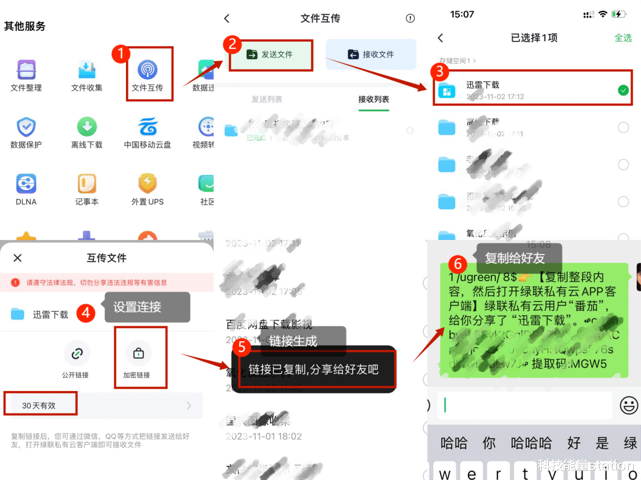 ▼发送端:在手机端就能操作完成:点击文件互传按钮——选择发送文件——选择需要传输的文件夹——设置有效期及分享链接——最后看到链接建成的提示后,复制链接分享好友即可。