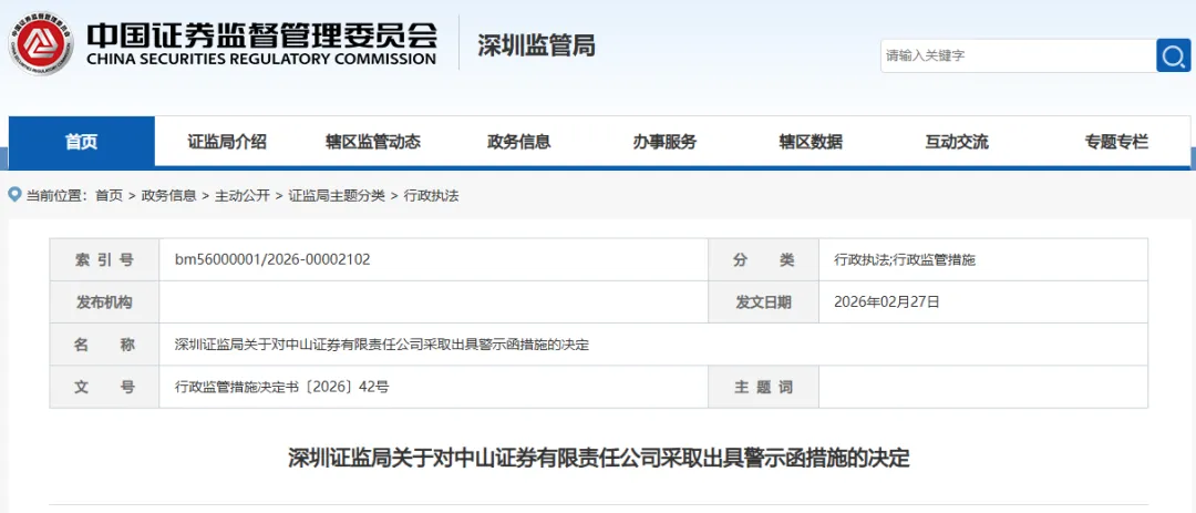 2026年2月27日,深圳证监局一日内向中山证券连开3张监管罚单,矛头直指公司经纪业务。警示函显示,中山证券在经纪业务展业中存在营销宣传不规范、对第三方互联网平台合作管控失效等问题。公司总裁、合规总监同日被出具警示函。