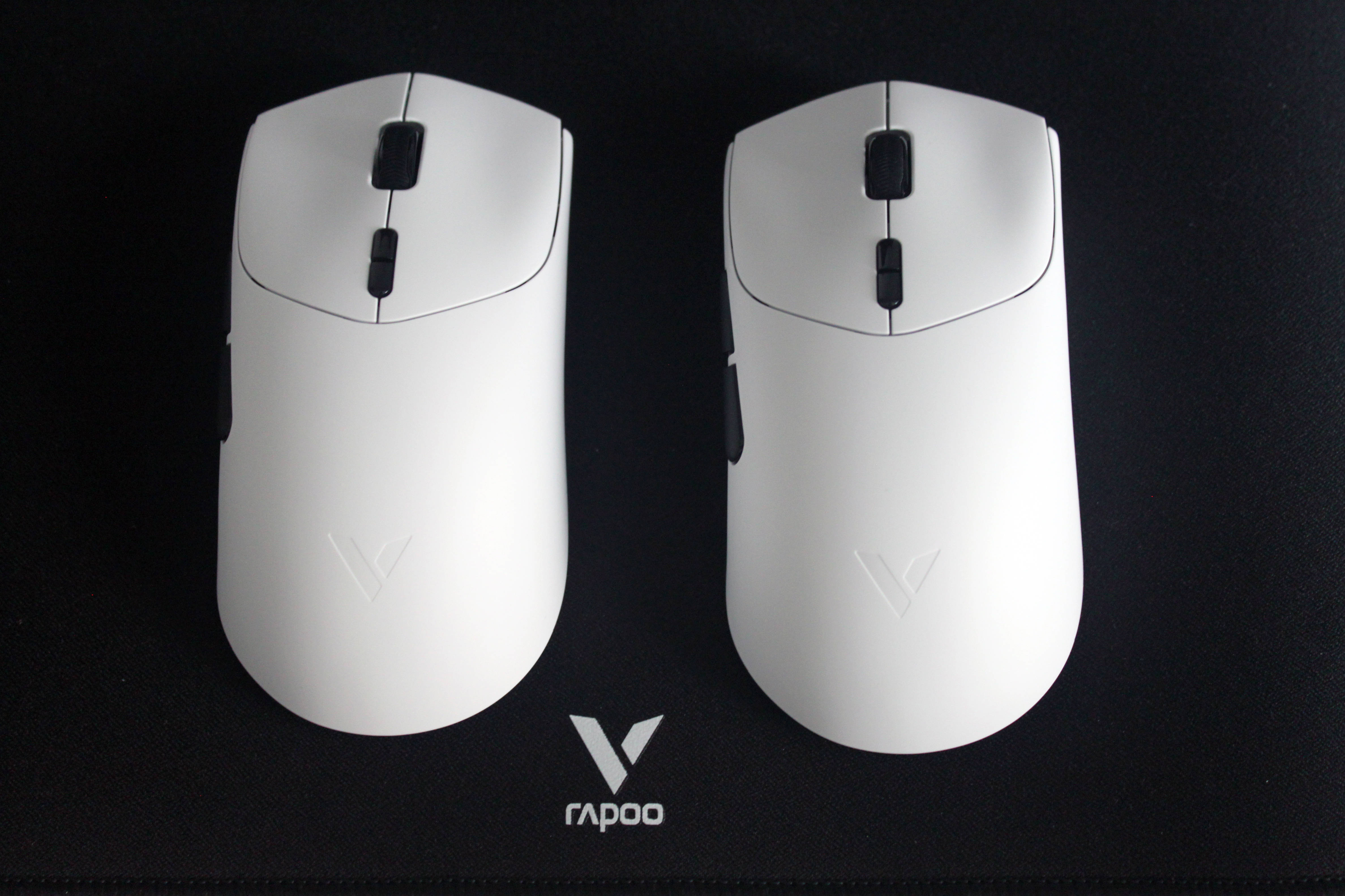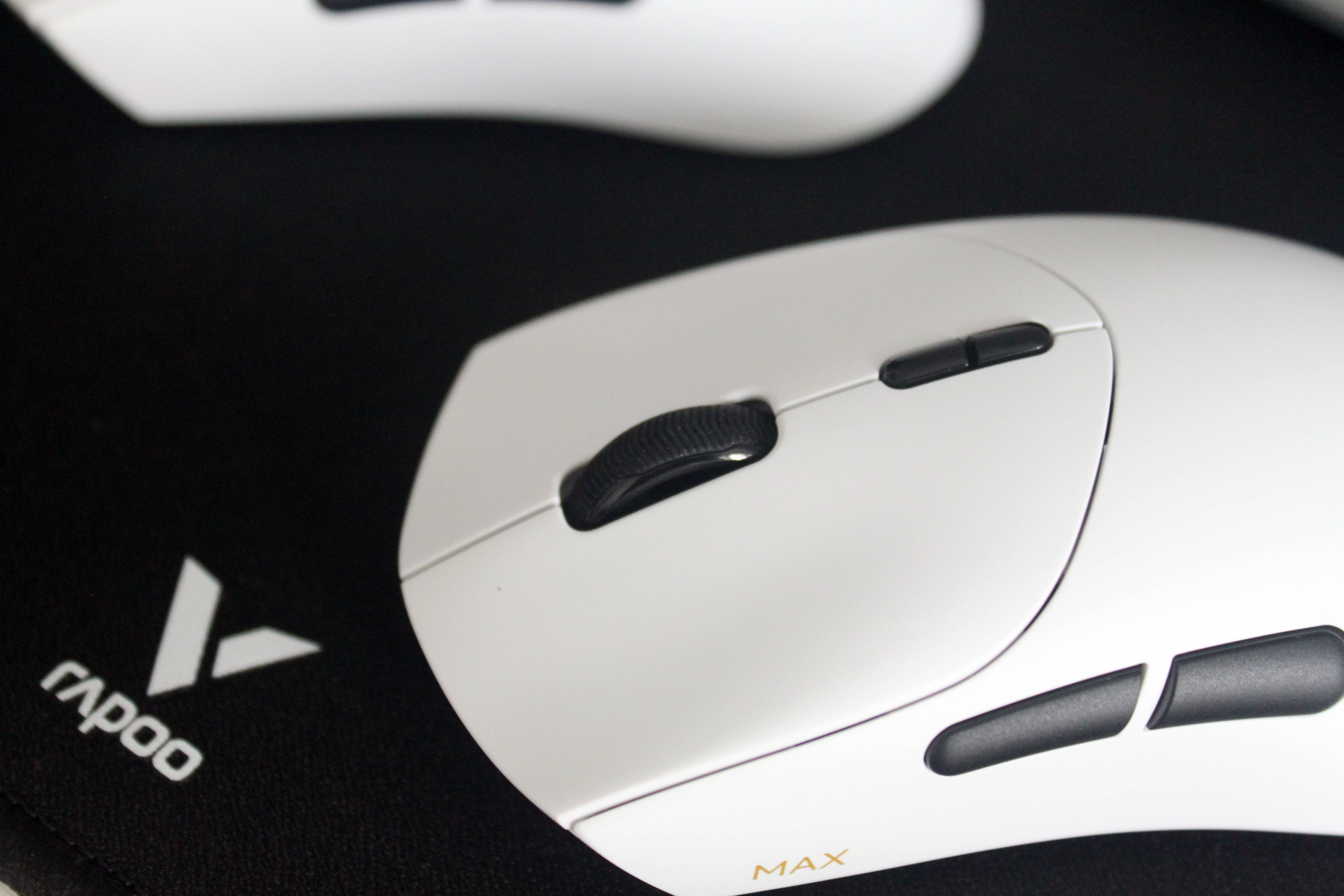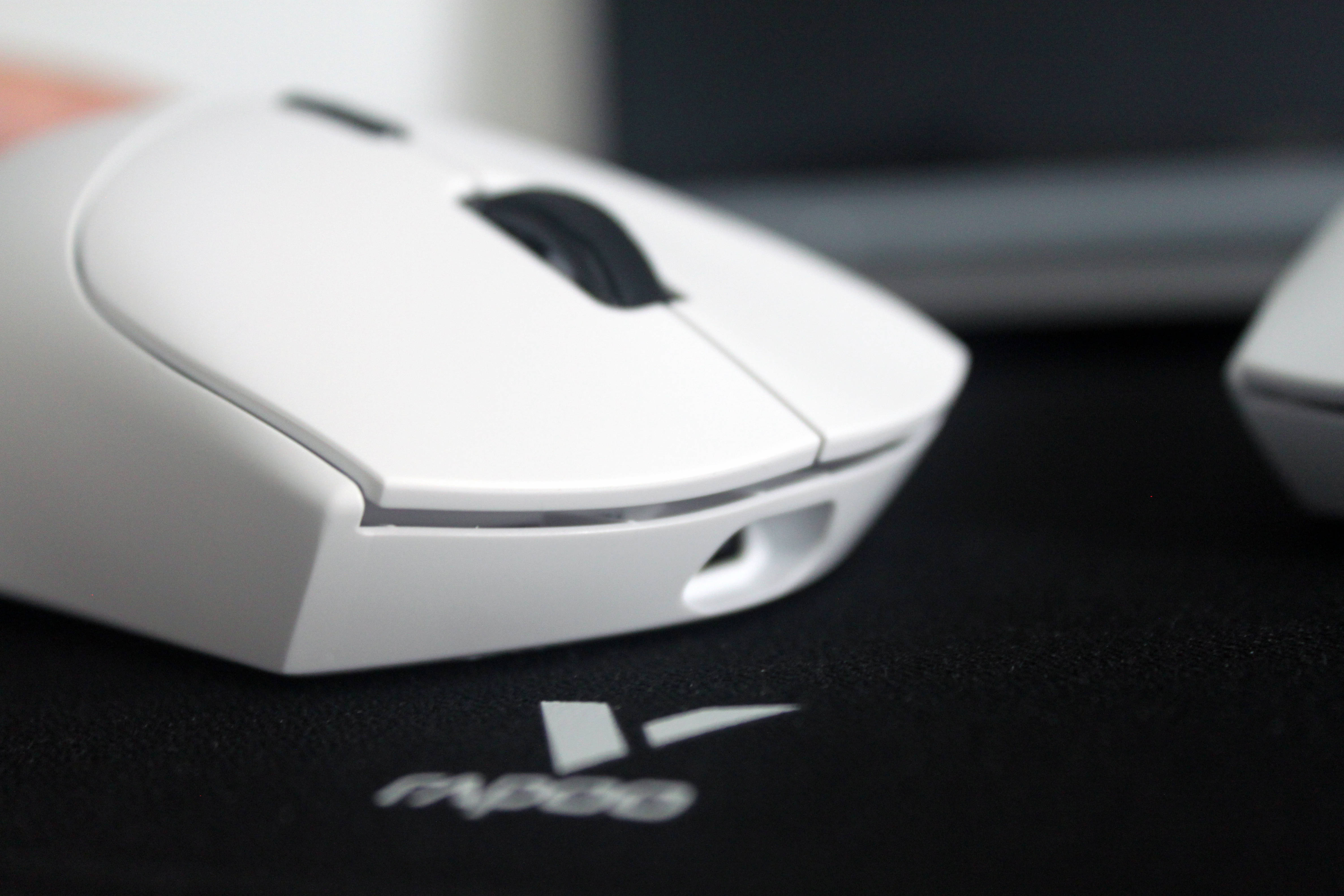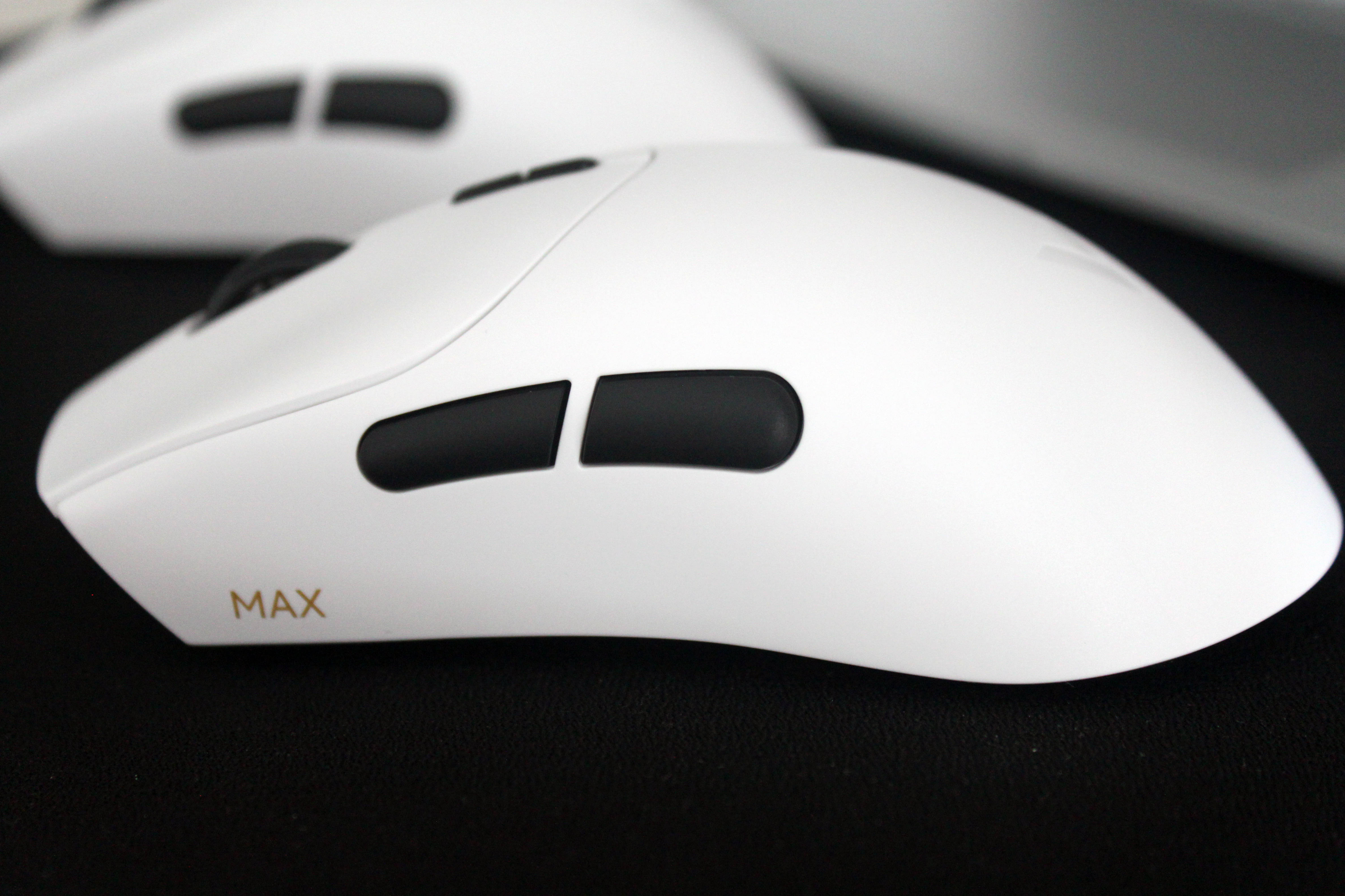 鼠标上盖拥有两种表面触感,MAX版全色加标准版的彩色版本使用的是亲肤防滑涂层,标准版的星空黑&皎月白则使用的是类肤磨砂工艺,触感温润舒适,能有效提升握持时的摩擦力,即使长时间使用手心出汗也不易打滑。在鼠标的裙尾还设计了一个V字的标识,不仅增加了额辨识度,也增加了整体的颜值。