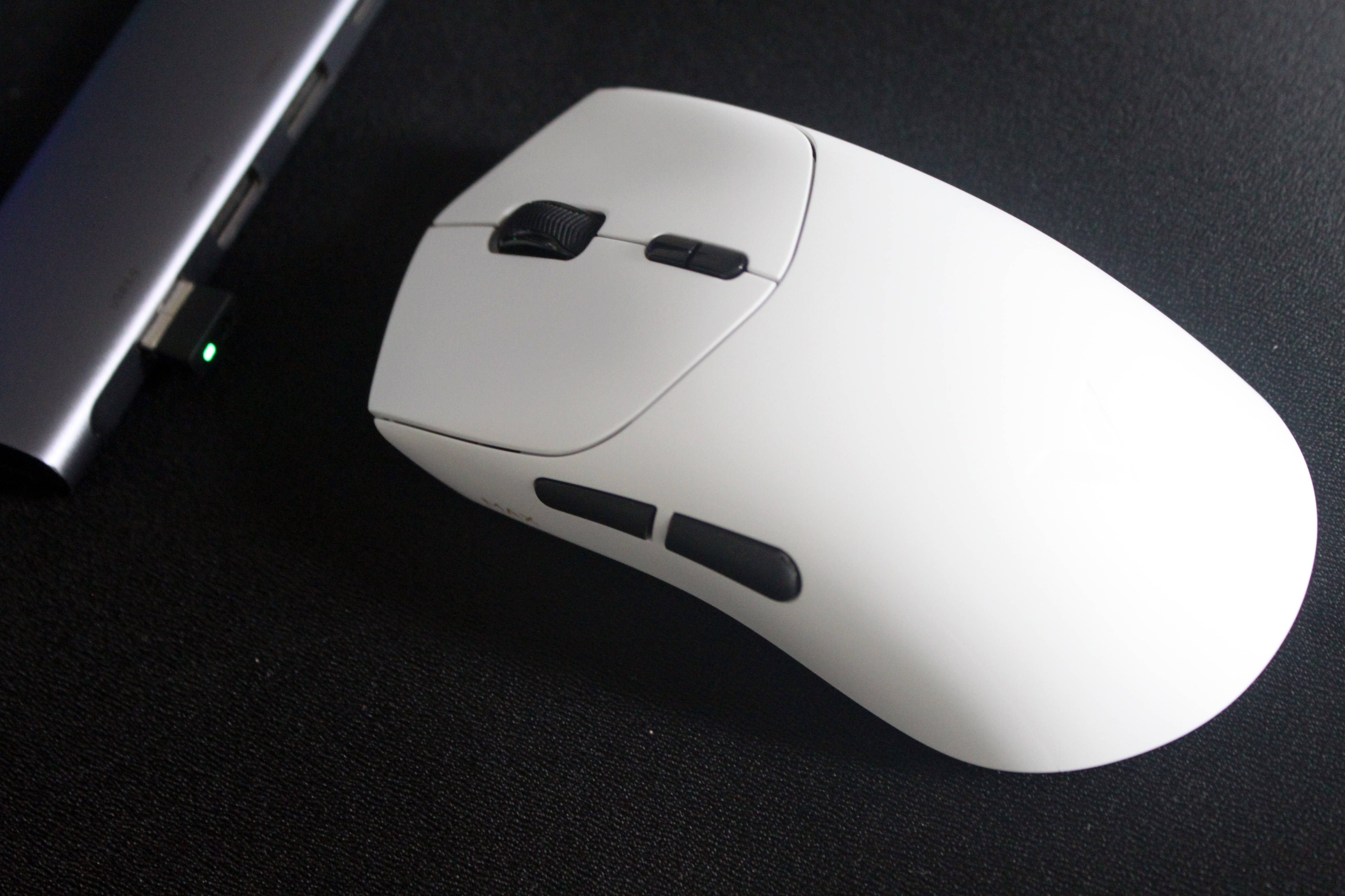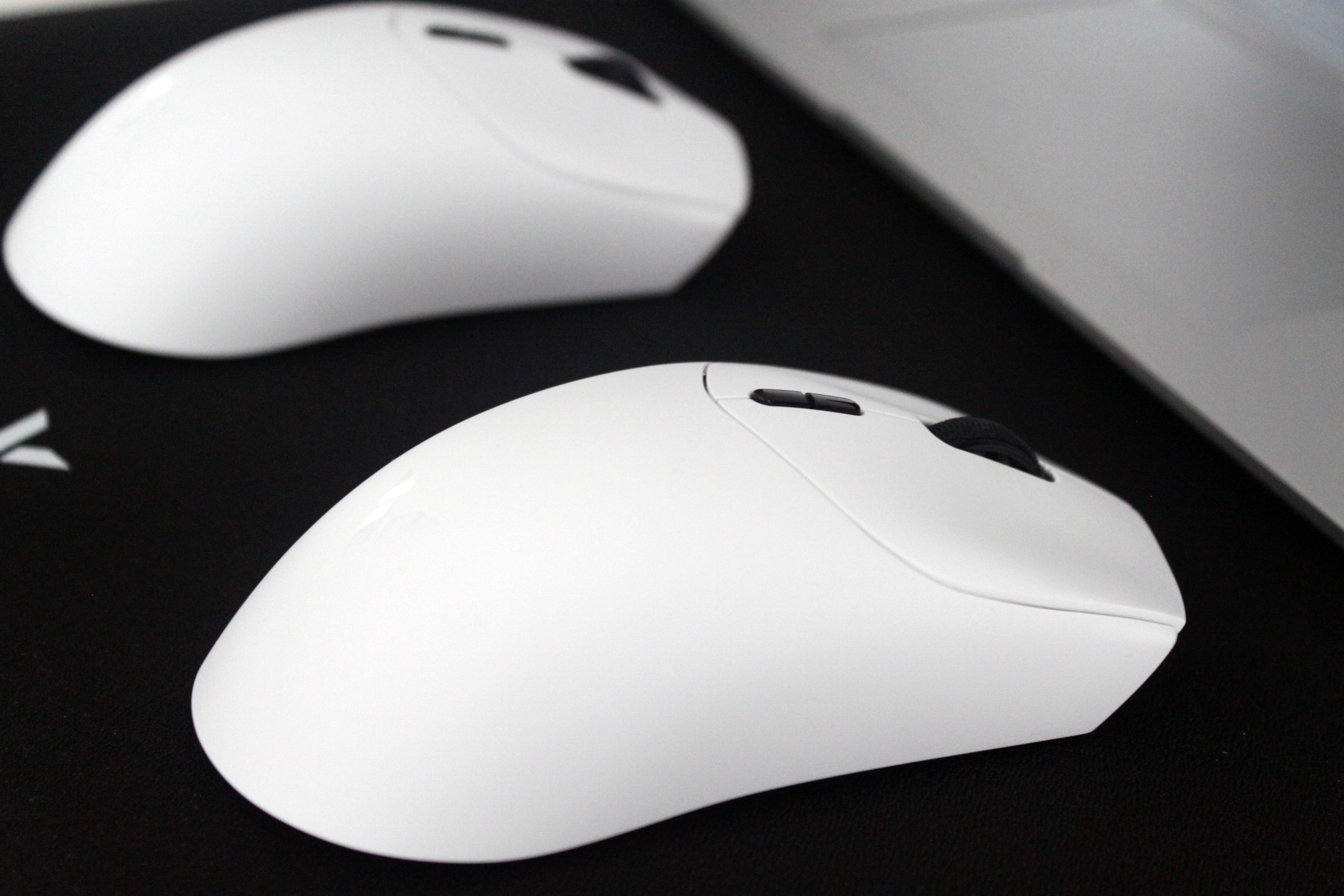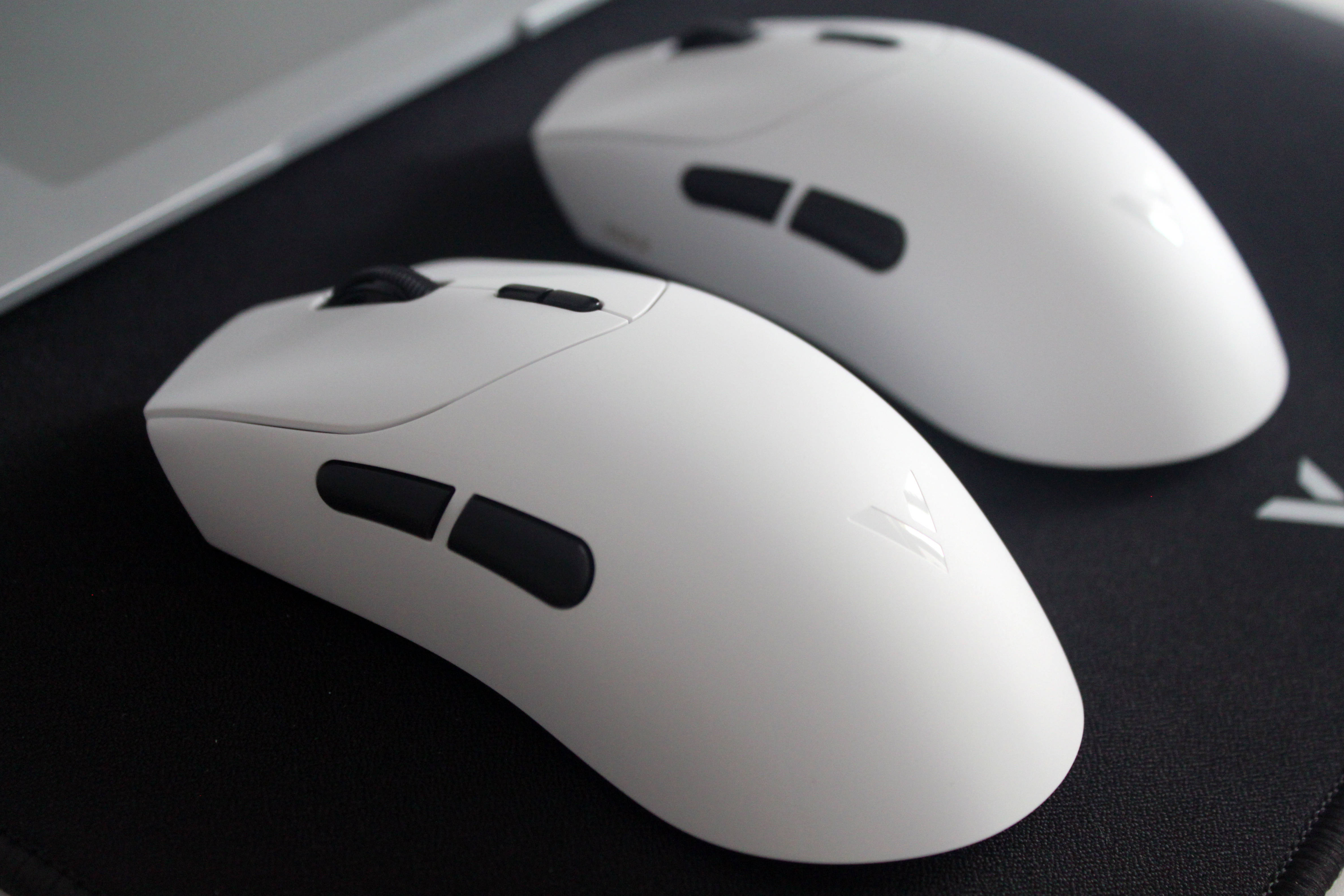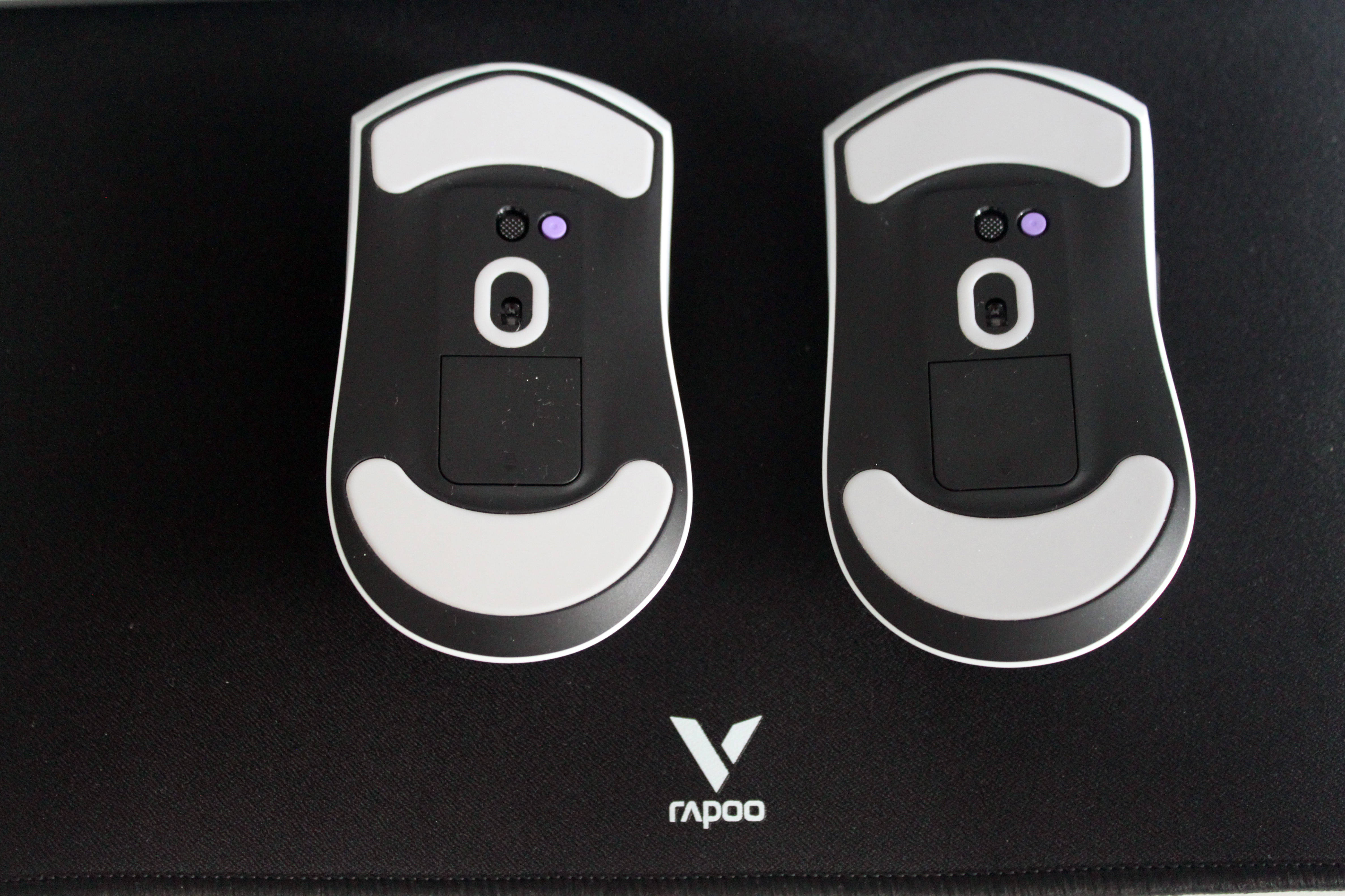 鼠标上盖拥有两种表面触感,MAX版全色加标准版的彩色版本使用的是亲肤防滑涂层,标准版的星空黑&皎月白则使用的是类肤磨砂工艺,触感温润舒适,能有效提升握持时的摩擦力,即使长时间使用手心出汗也不易打滑。在鼠标的裙尾还设计了一个V字的标识,不仅增加了额辨识度,也增加了整体的颜值。