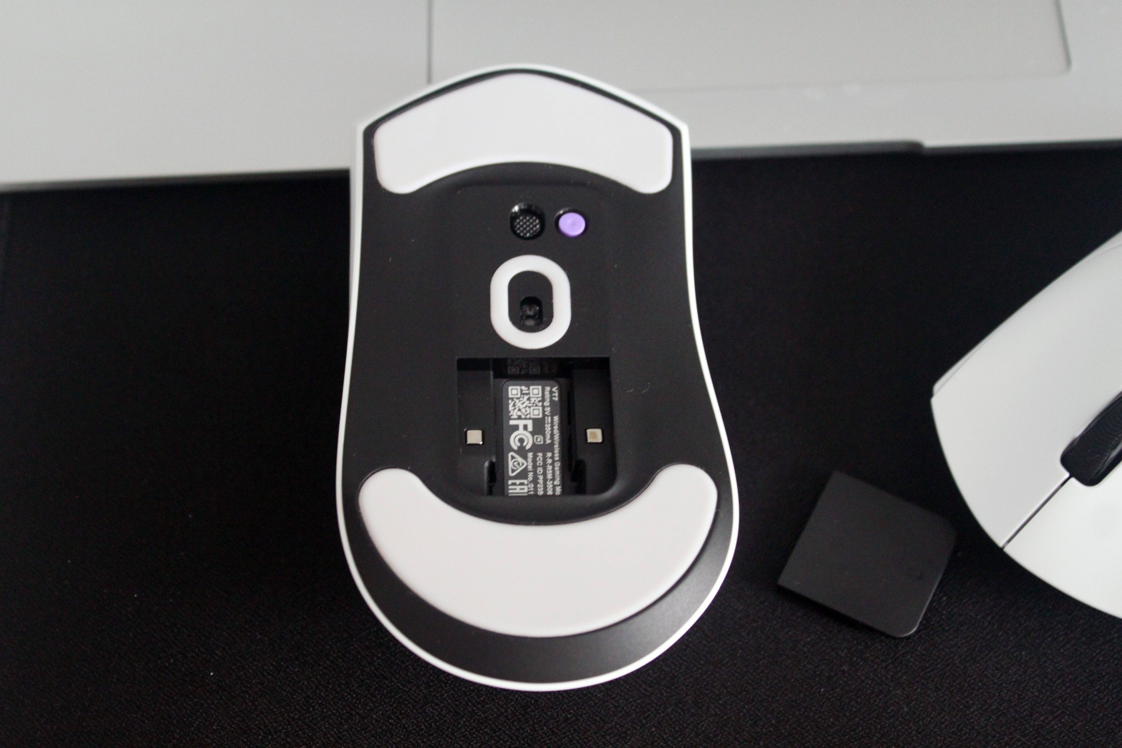 鼠标的背面上下面采用了大面积的防滑垫,增加了与接触面的摩擦力,即使在一些光滑的桌面上也可以灵活使用。鼠标还设计了一个USB接收器的隐藏式收纳仓,方便对接收器的收纳。同时还设计了一个紫色防触键,可以根据自己的需求进行DIY的设计。当然了,鼠标的开关键也设计在了鼠标的底部。