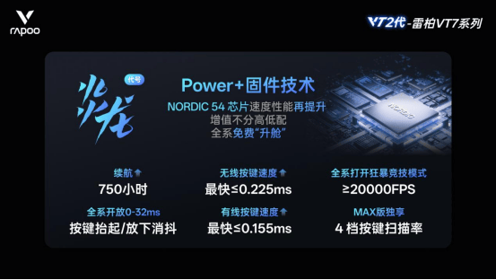而在芯片和传感器方面,VT7系列采用的是全球首发的Nordic 54系列芯片,标准版则是用了原相定制3398(高定版3395)传感器,MAX版则是使用了原相定制3950 Ultimate传感器,雷柏为其推出的全球首发Nordic 54系列芯片的VT7二代系列无线电竞鼠标推出了Power+(代号:炎龙)的固件技术,不分高低配,标准版、MAX版均可通过OTA增值。VT7 MAX开放了独享4档按键扫描率,1000Hz/2000Hz/4000Hz/8000Hz,≤0.225ms无线最快按键速度,≤0.155ms有线最快按键速度。VT7还加入了本来只有MAX版拥有的狂暴竞技模式,拥有市面上续航最强的超20000FPS全段扫描帧速率,加上高回报率,电竞强跟手感。800mAh锂电池下,鼠标在1K模式下,续航由原本500小时上升到惊人的750小时,此外VT9二代系列还加入了按键抬起、按下消抖延迟开放0-32ms可调。
