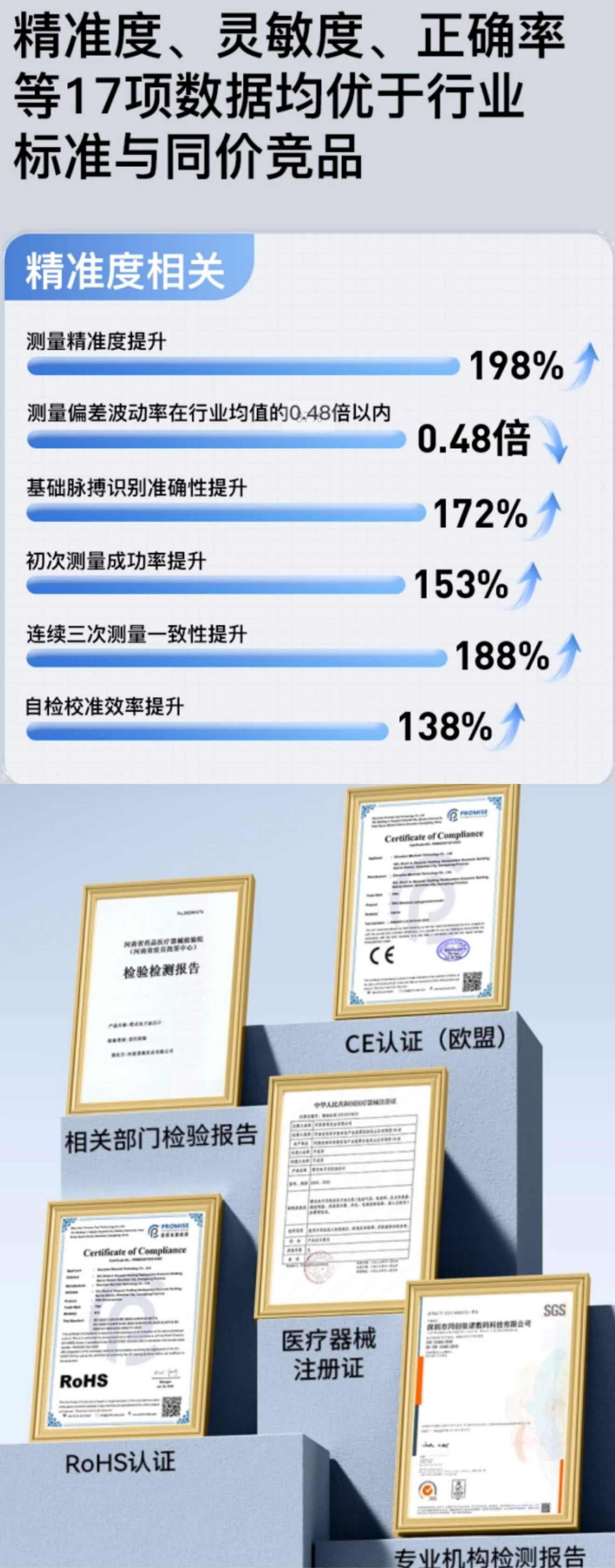 它能有这么精准的测量效果,离不开背后强大的核心技术支撑。它采用目前行业内最先进的测压技术,搭载四通道SOC芯片,运用三重校准算法和双循环检测传感器,配合医用级精准测量技术,还加入了自适应加压平衡技术和生物动态传感修正技术,可自动校准数值,确保每一次测量都精准可靠,不会出现偏差。实测下来发现,它的测量结果准确性提升203%,测量结果稳定性提升138%,误差比行业均值小2倍,比我之前买的任何一款血压计都靠谱,给爸妈用着我也更放心。