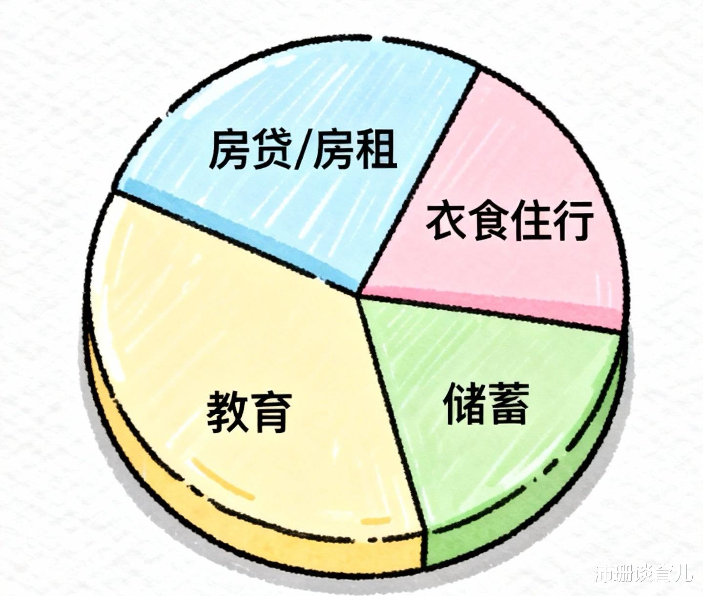 然后可以继续分解:“但这些钱不是都能拿来买巧克力的哦。它们像一块大蛋糕,要被分成好几块:最大的一块要付房贷/房租,让我们有温暖的家;另一块要付水电燃气、物业费,保证家里灯会亮、水龙头有水;还有一块是你的学费、课外班费用和全家人的保险;再有一块是买菜、买衣服、交通的日常开销;最后剩下的一小块,才是可以存起来或者偶尔出去旅游、买大件儿的。”