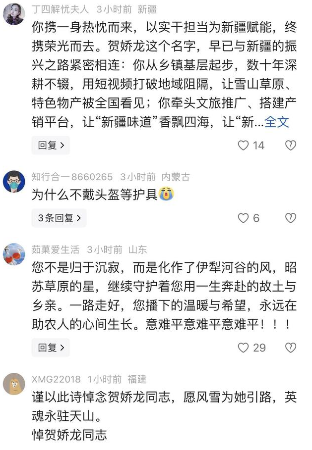 消息传来,无数网友自发留言悼念。有人写下悼诗:“红袍雪域映丹心,为爱披靡志未沉”;有人感慨她是 “伊犁河谷的风,昭苏草原的星”;更多人记得,是她用短视频打破地域阻隔,让雪山草原的壮美风光、香甜浓郁的新疆物产,走进了全国人民的视野。