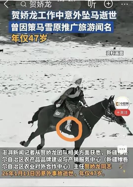 2026 年 1 月 14 日 23 时 12 分,一则噩耗传遍全网:新疆维吾尔自治区农产品品牌建设与产销服务中心主任贺娇龙,因伤抢救无效不幸离世,年仅 47 岁。这个曾身披红袍、策马驰骋在昭苏雪原,被网友称为 “最飒文旅局长” 的女人,永远定格在了她挚爱的这片土地上。