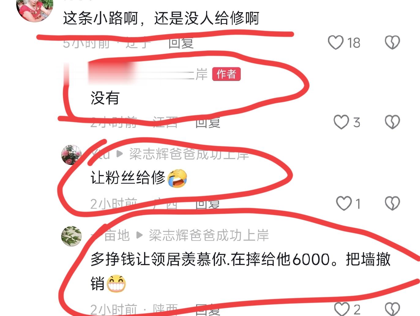 梁爸回应了自家门前小路的进展因为梁志辉认亲当天,家门口那条狭窄的小路一直是网友们心中的意难平,尽管这件事过去很久了,但是今天梁把发的一条视频网友们又旧事重提!