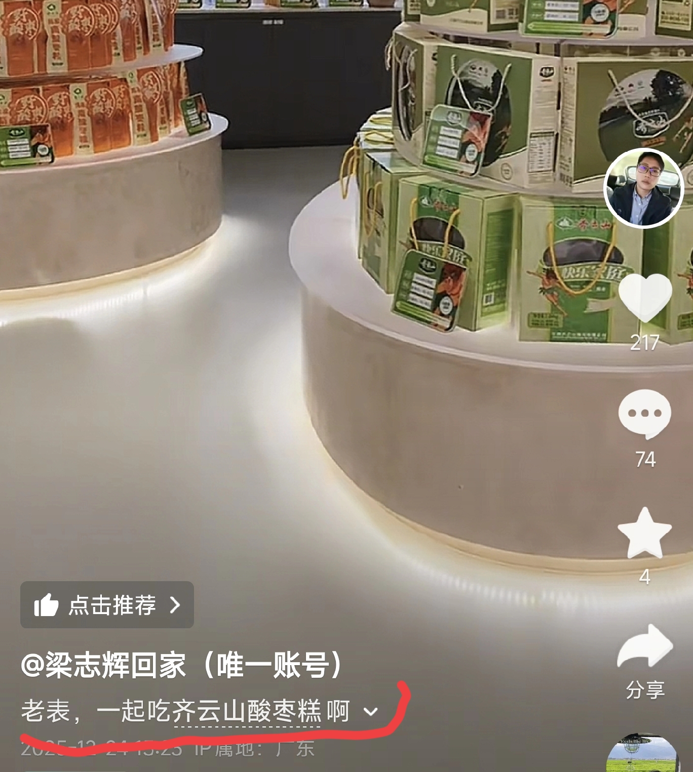 梁志辉今天更新了一天动态,应该是家里人给他发的视频,视频中全是齐云山那边的食品酸枣糕!