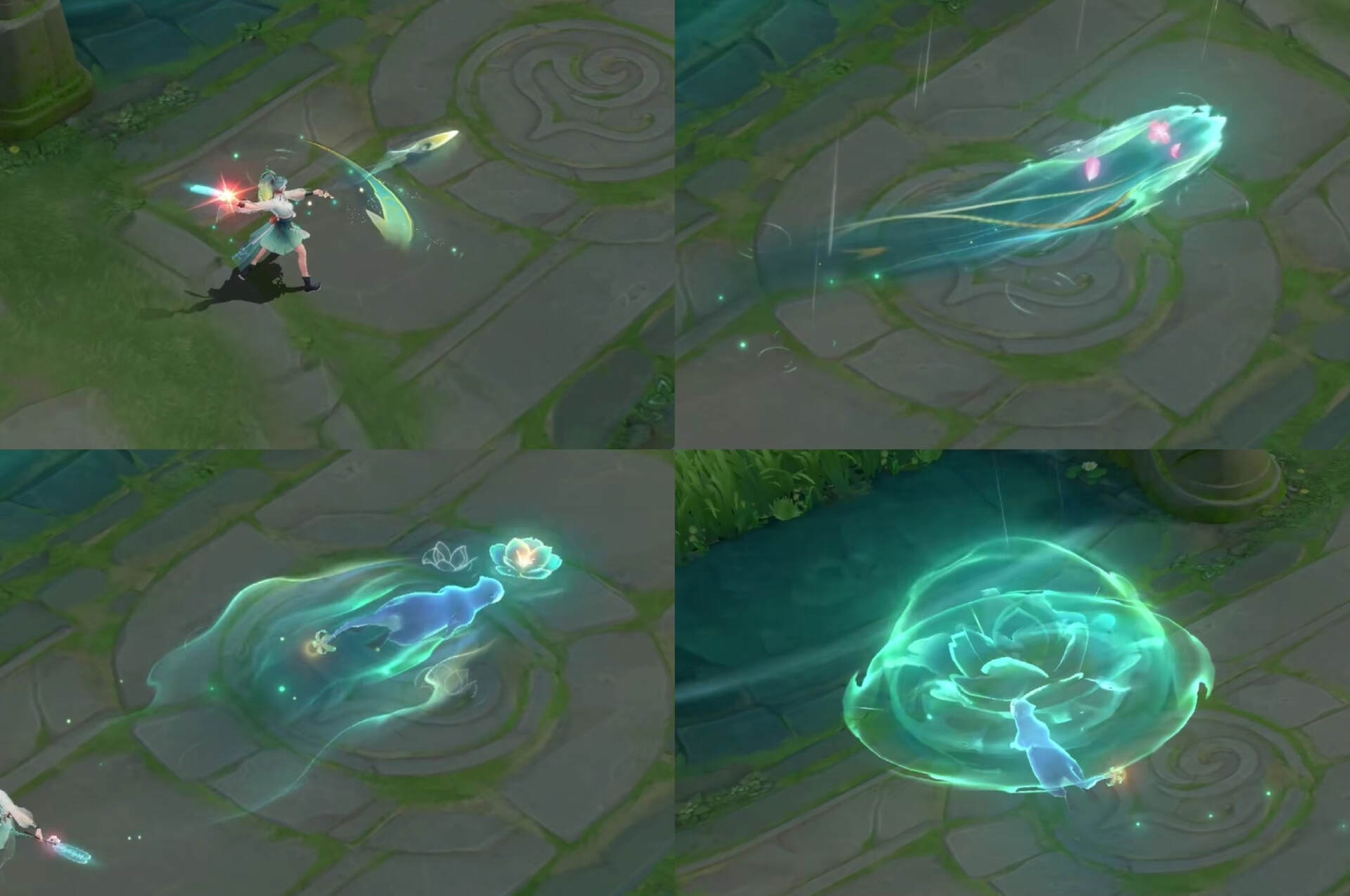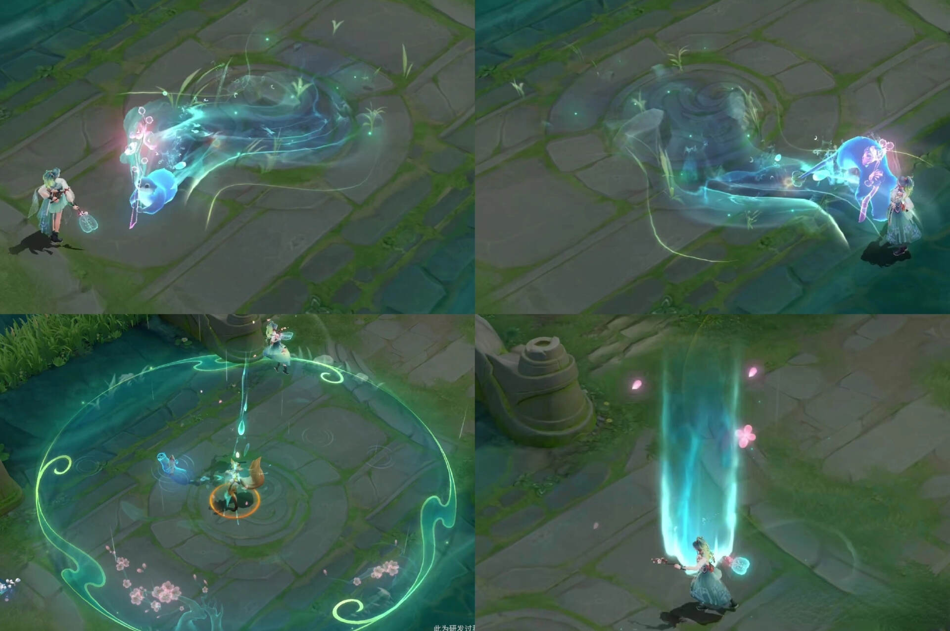 但从整体上来看,其实也展现出了那种和雨水相关的特点,虽然色彩是淡绿色,但是整体也能够看到出用的雨水塑造的一种意境,但不得不说,特效还是比较简单的,并没有体现出这是一款很高级的史诗皮肤的感觉,反正一技能和二技能并没有啥特点,其实可以看到有一个水赖。