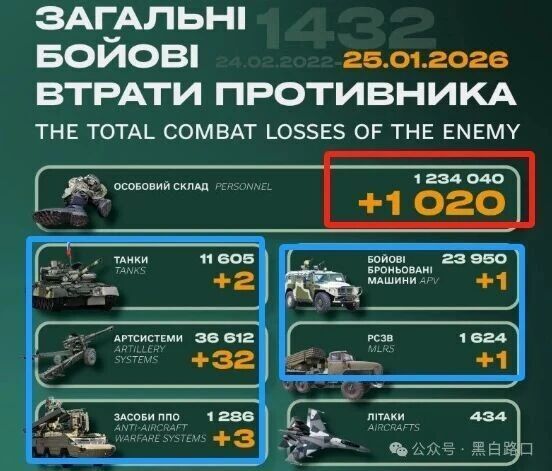 俄乌战争第1432天(2026年1月25日),过去24小时大事件概述如下: