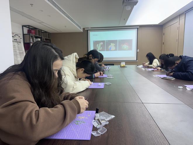 活动现场,老师首先为大家详细介绍了螺钿工艺的历史渊源。作为中国传统漆艺中的瑰宝,螺钿以其色彩斑斓、光华流转的特点被誉为“指尖上的霓裳”。听完讲解后,大家对这一古老技艺产生了浓厚兴趣,迫不及待地开启了创作之旅。