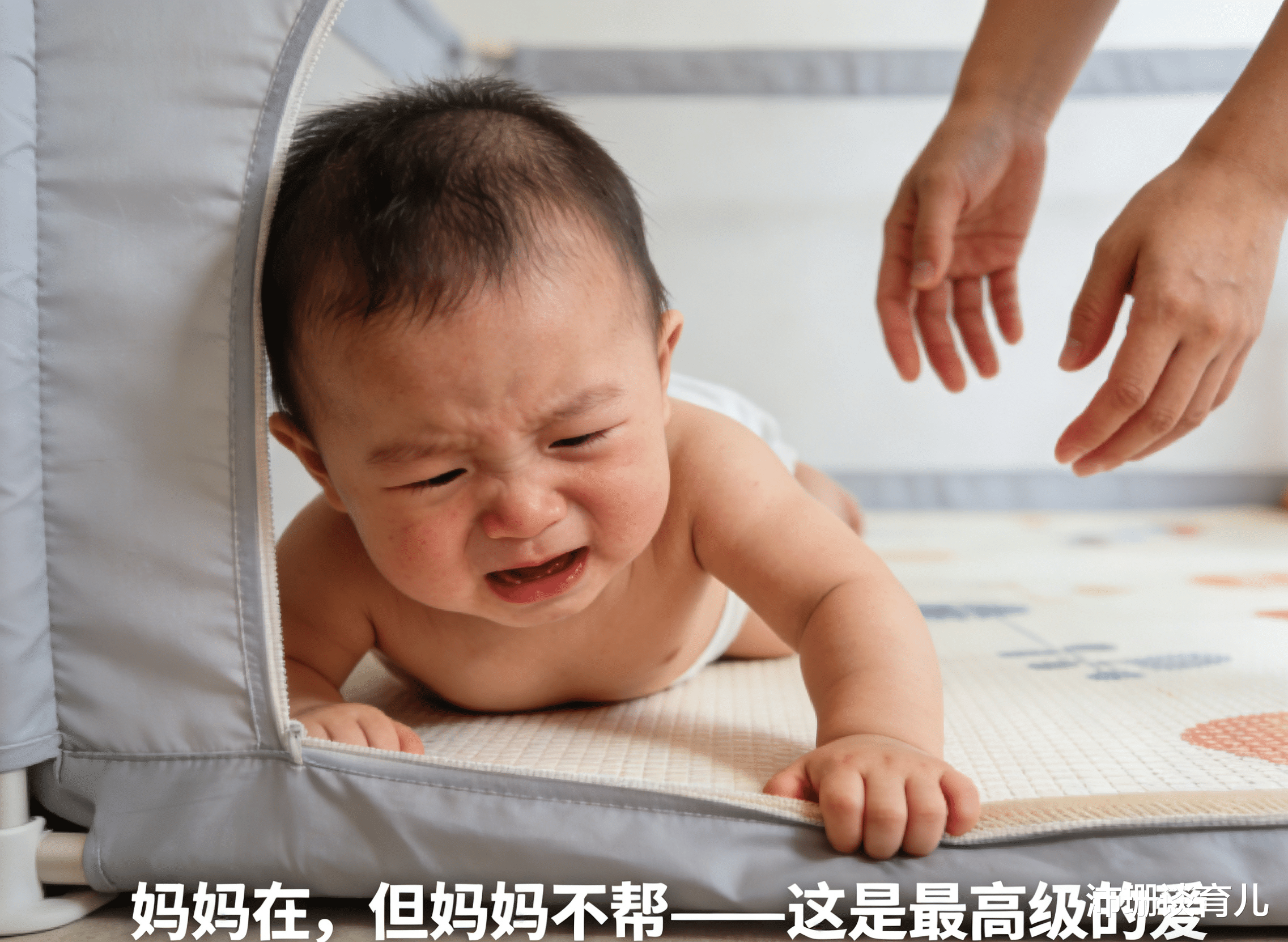 只要没有危险(快滚下床、撞到尖锐物),你就忍着。他翻不过去哼哼,你可以在旁边拍拍手:“宝宝加油!妈妈看着你呢!”但别上手。
