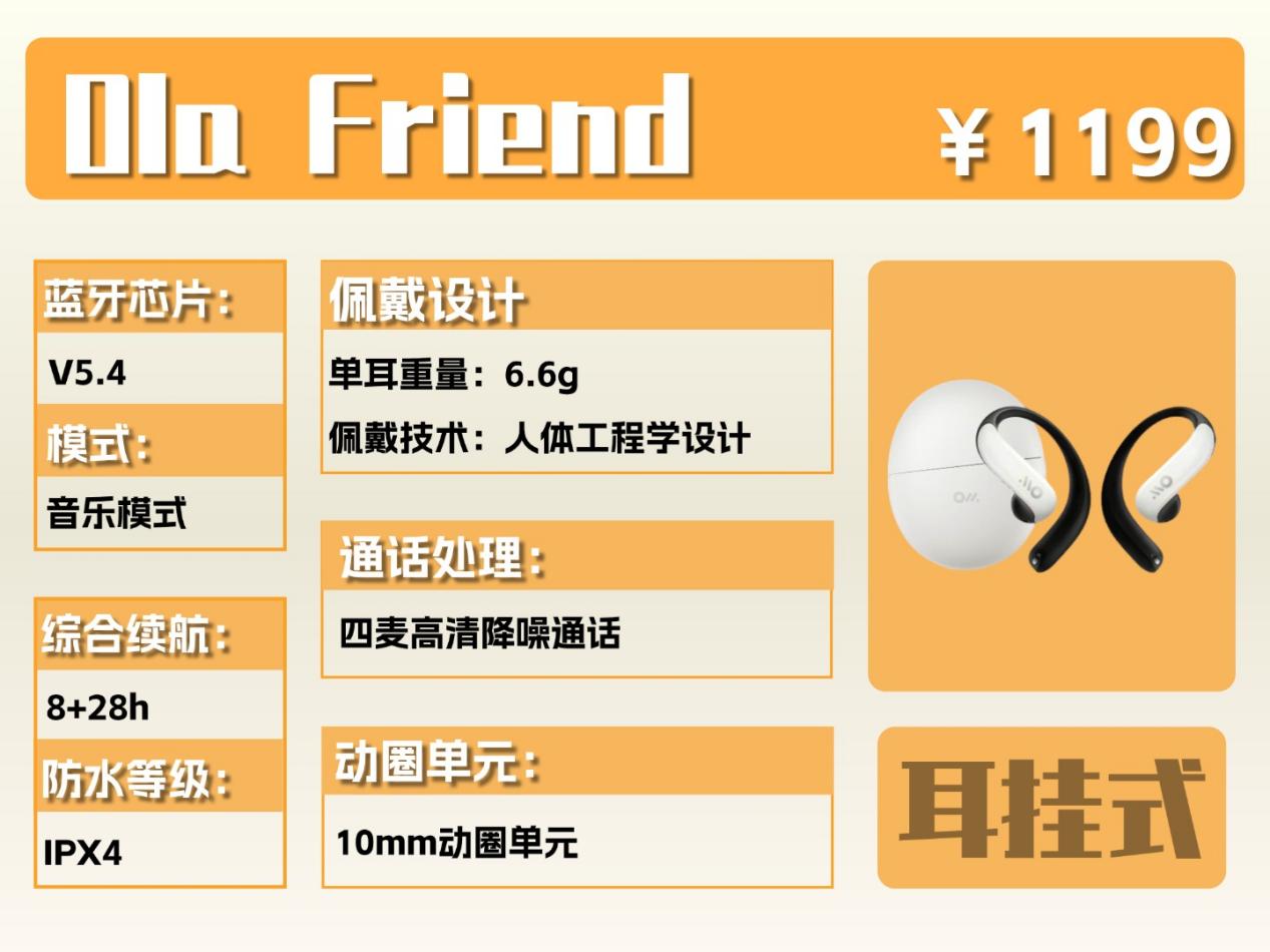 Ola Friend价格:1199 元推荐程度:★★★★推荐理由:耳机的佩戴感很舒服,重量很轻,整体表现也好,预算够,可以入手!