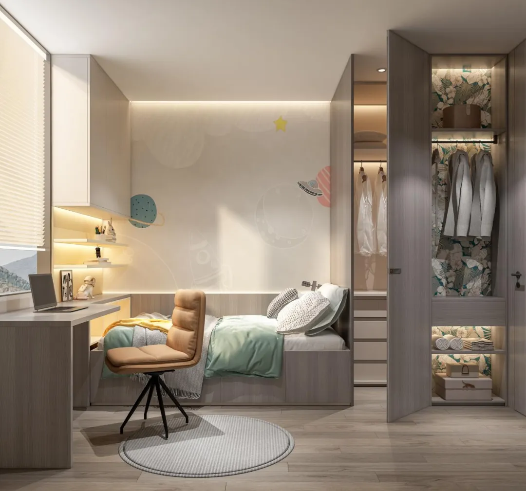 一个理想的儿童房,要能满足孩子休息、学习、玩耍等多元需求。合理规划空间,能让有限的面积发挥出无限可能。若房间面积较小,一体化设计的榻榻米是不二之选,它将床、书桌、衣柜巧妙融合,下方的抽屉和储物柜大幅增加收纳空间,书桌与衣柜相连,方便孩子学习与存放物品。对于面积宽敞的房间,则可划分出清晰的功能区:安静的休息区、专注的学习区和欢乐的玩耍区,让孩子在不同场景中自由切换。