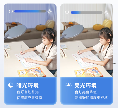 调光不仅是亮或暗”的调整,而是关系到用眼负担的系统工程。现在许多高端护眼灯都搭载智能调光系统,能主动感应环境光变化并自动调整亮度,保持桌面照度的稳定,避免过暗伤眼、过亮刺眼。相比传统手动调节,智能调光能让人更专注,不必频繁分心去调灯光,也能确保孩子在不同时间、不同天气下都保持合适的光照环境。