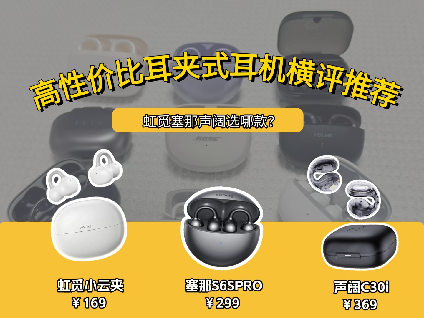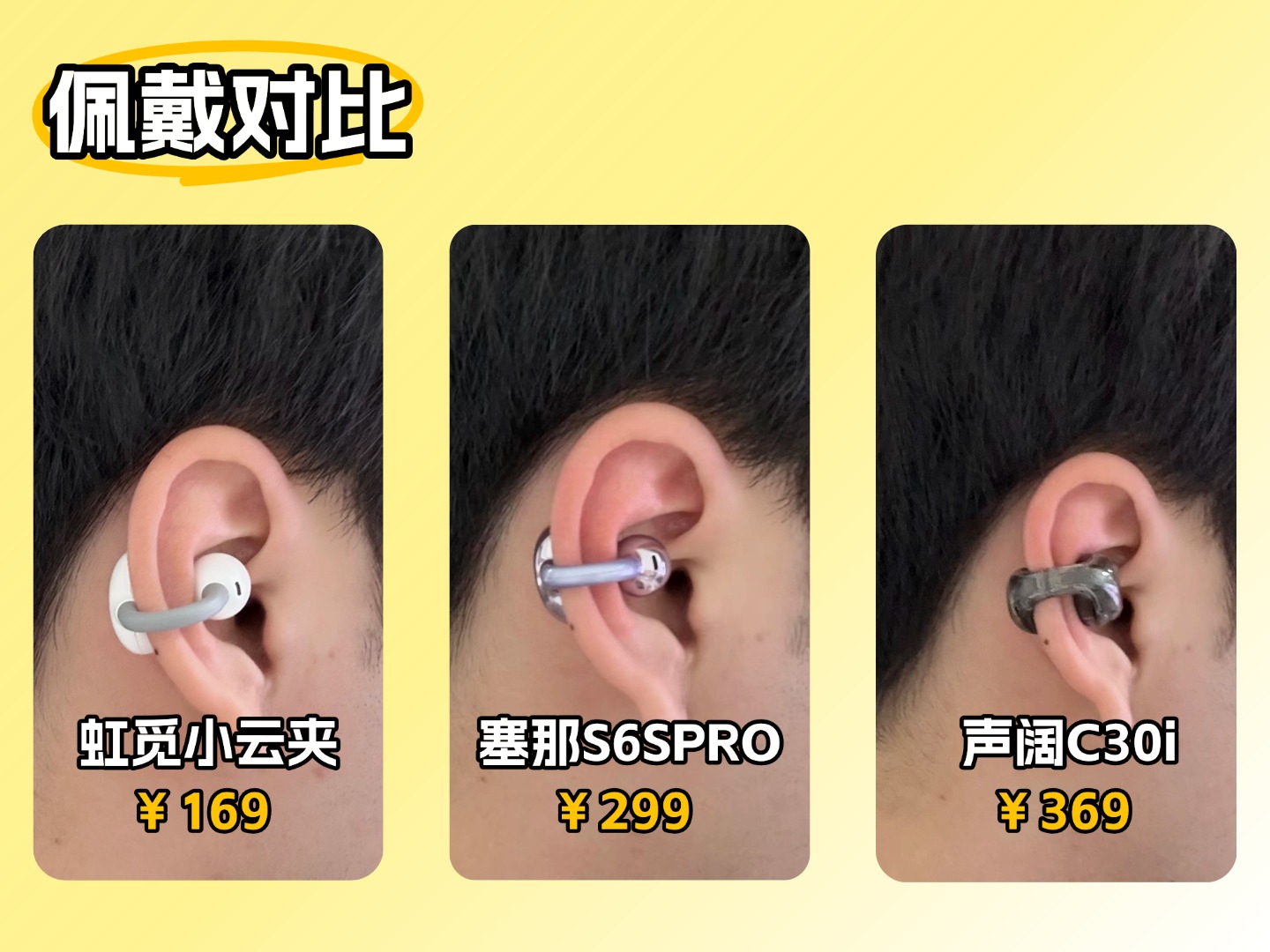 其实选耳夹式耳机真没有那么困难,关键是得看清楚产品在核心功能上到底表现怎么样。这次我特意挑了三款最近卖得火、价格也挺亲民的机型,从佩戴感受、音质效果到续航时长,都好好做了对比,就是想帮大家弄明白,到底哪款是真的值得入手。这三款分别是 169 元的虹觅 Air2小云夹、299元的塞那S6S Pro,还有369元的声阔C30i,都是市面上口碑还不错的款式。先跟大家说说这几款的基本情况,看完之后,说不定你选耳机的时候就能少走点弯路、少些麻烦了。