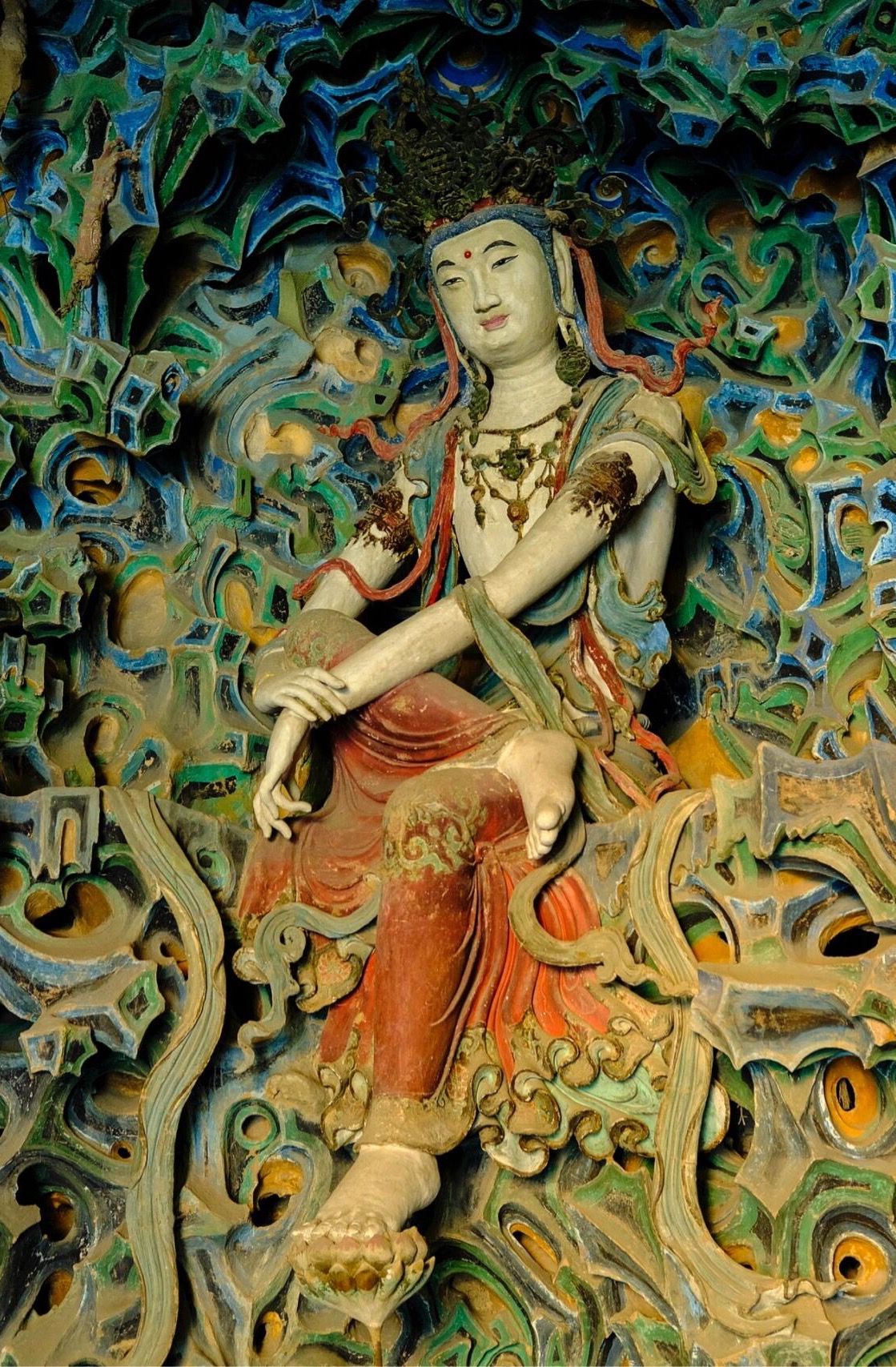 殿内最著名的,还要数内槽背壁后的“倒坐观音”。这尊观音像高约五米,通体彩绘,头戴宝冠,身披璎珞,双手结印,端坐于莲花座上。与众不同的是,她不像其他观音像那样面朝殿门,而是背对着殿门,面朝北壁的壁画,因此被称作“倒坐观音”。据碑文记载,这尊像重塑于明嘉靖四十二年(1563),至今已有四百多年历史,可色彩依然鲜艳,衣袍上的金线还在昏暗的光线下泛着微光。观音像的面部表情极为生动,嘴角微微上扬,眼神温柔却不失庄严,仿佛在凝视着壁画里的佛教世界,又似在俯瞰着殿内来来往往的信徒。让人好奇的是,工匠为何要将观音像倒坐?有人说这是为了与北壁的壁画形成“呼应”,让观音像“观看”壁画中的佛教故事;也有人说“倒坐”寓意着“观音菩萨不度尽众生,誓不回头”,体现了佛教的慈悲精神;还有人猜测是明代修缮时,殿内空间有限,只能将观音像背靠墙壁摆放——每种说法都有道理,却都没有确凿的证据,让这尊倒坐观音成为了摩尼殿的又一个谜题。