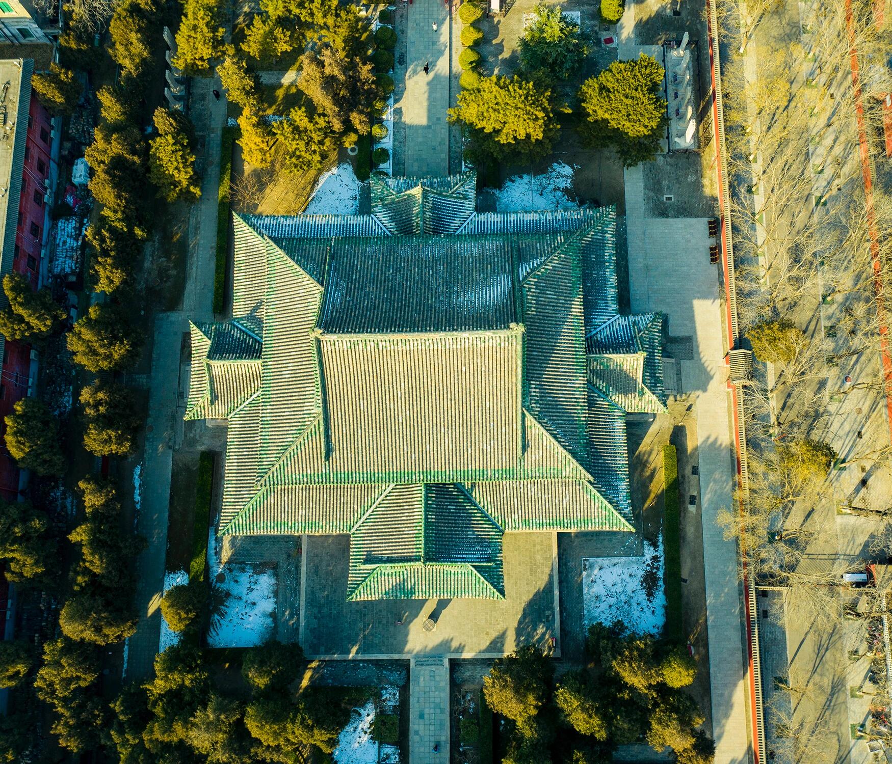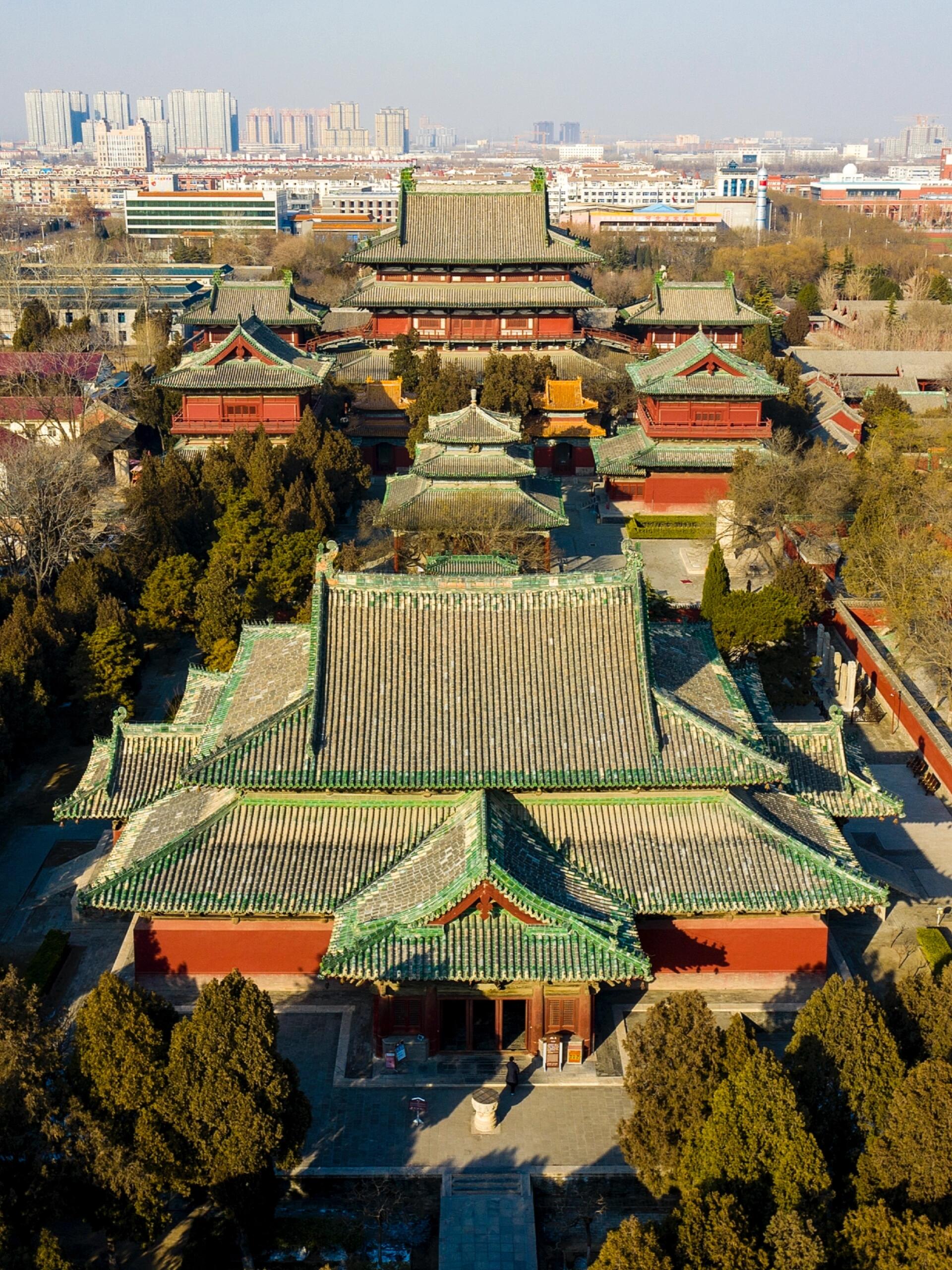 摩尼殿最惊艳的,是它那座“十字歇山顶”。在中国古代建筑的屋顶形制里,歇山顶本就比硬山顶、悬山顶更显庄重,而摩尼殿却将四个歇山顶拼合成十字形,四个方向的檐角各自翘起,又在顶端汇合成一个平缓的攒尖,远远望去,像一只展翅欲飞的巨鸟,又似一朵绽放的莲花。这种形制在北宋之前从未有过,之后也鲜有模仿者,难怪会被称作“孤例”。仔细观察会发现,每个歇山顶的坡度都经过精心计算,东北、西北方向的檐角坡度稍陡,能快速排走冬季的积雪;东南、西南方向的坡度略缓,既不影响排水,又能减少夏季暴雨对瓦面的冲击。屋顶覆盖的是宋代常见的“布瓦”,瓦片层层叠压,接口处用灰浆密封,历经千年风雨,除了少量瓦件破损,整体依然完好。最妙的是屋顶的“脊兽”,从戗脊到正脊,依次排列着龙、凤、狮子、天马等瑞兽,每一只都雕刻得栩栩如生,尤其是正脊两端的鸱吻,龙头向内,尾鳍翘起,既起到了装饰作用,又能加固屋脊,防止雨水渗漏——这种“实用与美观兼顾”的设计,正是北宋工匠的高明之处。