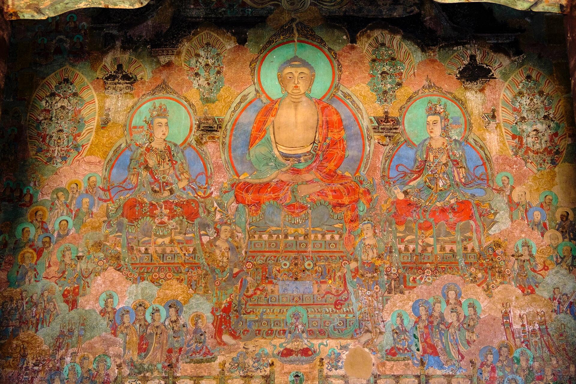 走进殿内,光线骤然变暗,最先映入眼帘的不是佛像,而是满墙的壁画。壁画以佛教故事为题材,从东壁的“释迦牟尼诞生”到西壁的“五百罗汉图”,每一幅都色彩绚丽、线条流畅。虽然部分壁画已经褪色,但仍能看出当年的色彩搭配:用朱砂画人物的衣袍,用石青画天空与祥云,用金粉勾勒细节,浓烈却不刺眼。壁画的线条纤细却有力,人物的发丝、衣纹的褶皱都刻画得极为精细,尤其是“飞天”的飘带,仿佛真的在随风飘动。让人疑惑的是,这些壁画究竟是宋代原迹,还是明清修缮时重绘的?有人说壁画的风格与宋代院体画相近,线条与色彩都带着北宋的雄浑;也有人发现部分壁画的颜料里掺了明代才有的“群青”,推测是明清工匠在宋代壁画的基础上修补的——这个争议至今没有定论,却让这些壁画更添了几分神秘。