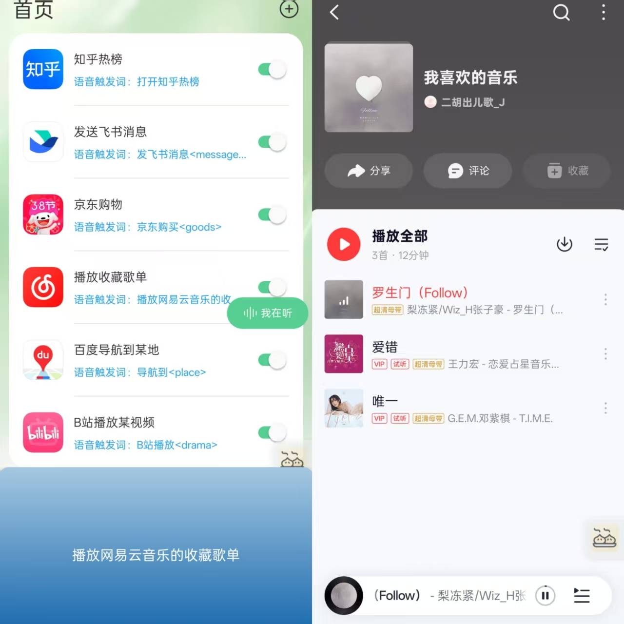 平时休息的时候,我喜欢听听音乐、看看视频放松一下。用煎饺App来操作这些娱乐软件也非常方便。我想听网易云收藏的歌,只要说“播放网易云音乐收藏的歌单”,它就会自动打开音乐软件,开始播放收藏的歌曲。