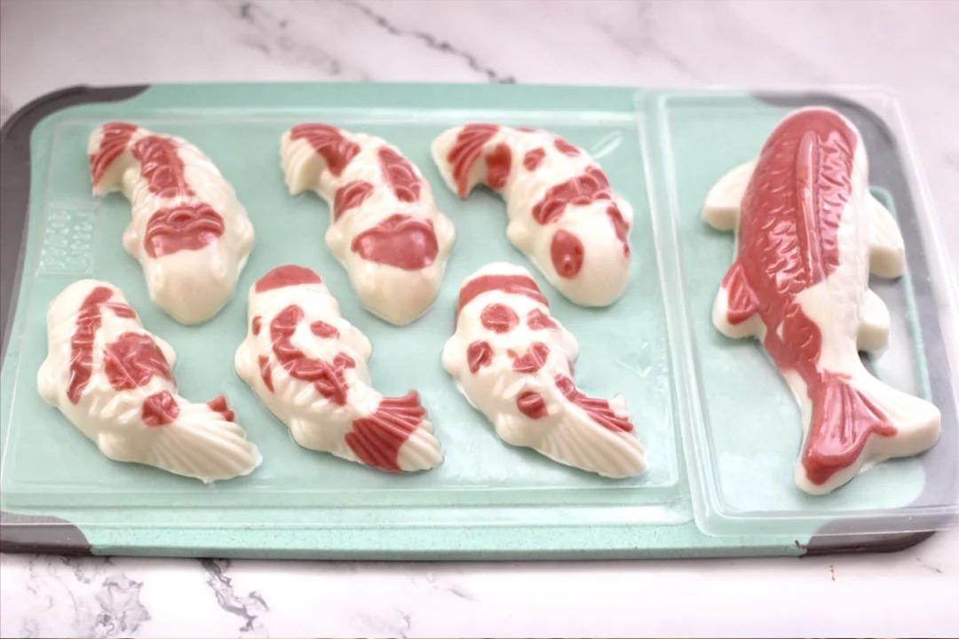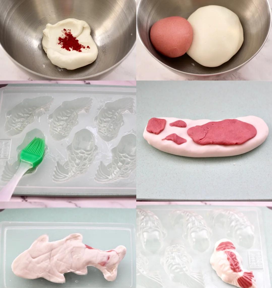 3、下面就开始做锦鲤年糕鱼咯。先揪一块白色的小面团,搓成鱼的大概形状,再揪一点红色的面团,随便搭配在白色面团上面,就像给小鱼穿上漂亮的衣服一样。弄好后把面团放进模具里,按压抹平,一条小锦鲤鱼就做好啦。要是觉得形状不太满意,还能随时调整调整。
