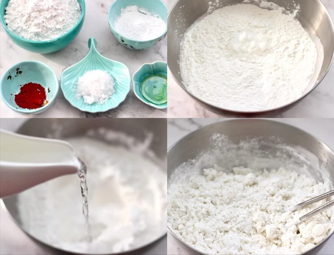 食材:450 克糯米粉、50 克澄粉、20 克白糖、20 克玉米油、300 克开水、少许红曲粉