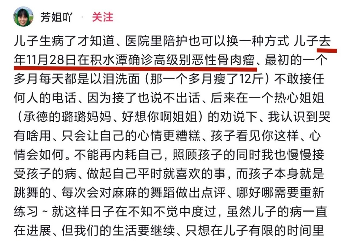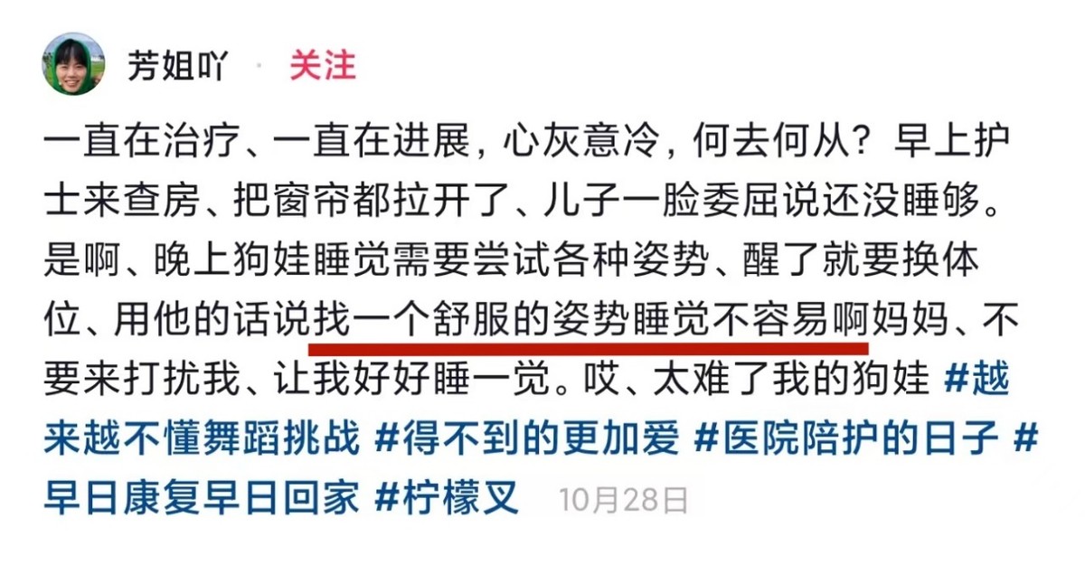 2025年10月28日,芳姐在发布的动态里说,儿子找一个舒服的睡觉姿势都很不容易,可见此时只有15岁的孩子正在经受着多大的痛苦。