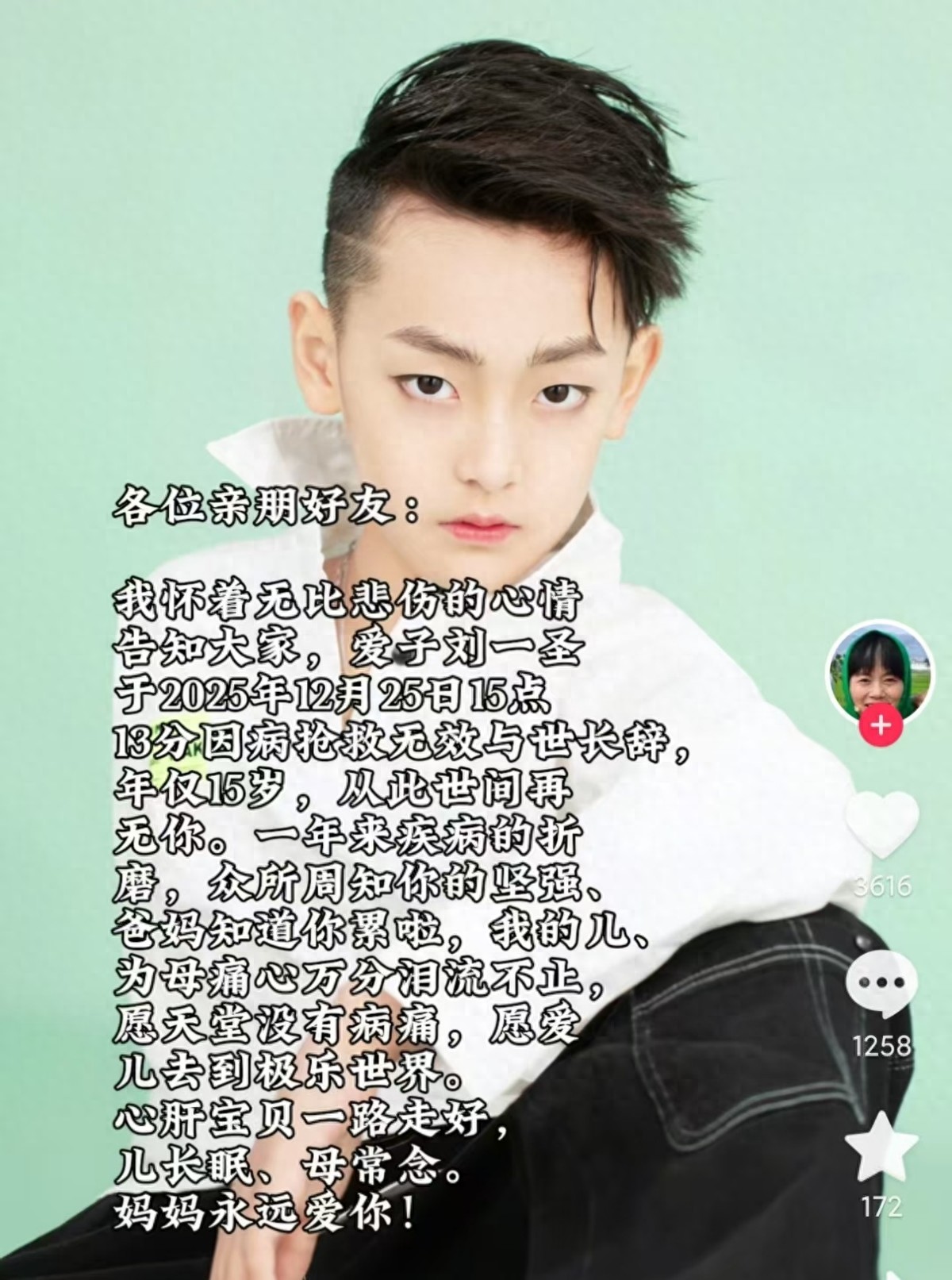 12月25日,河南网红芳姐吖突然发布讣告:她的儿子刘一圣于12月25日15时13分抢救无效去世,只有15岁。