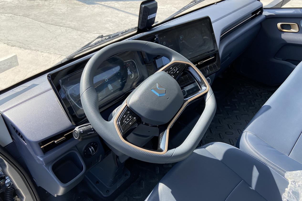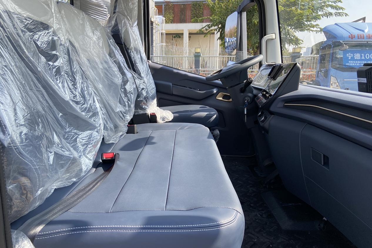 内部空间方面也十分可观,采用了2120mm宽驾驶室,就算是内宽也能达到1900mm以上,把座椅当卧铺可以完全躺平,而且驾驶室还是平地板,进一步放大了空间,连副驾驶座椅底下都做成了大容量储物箱,舒适性比油车强不少。