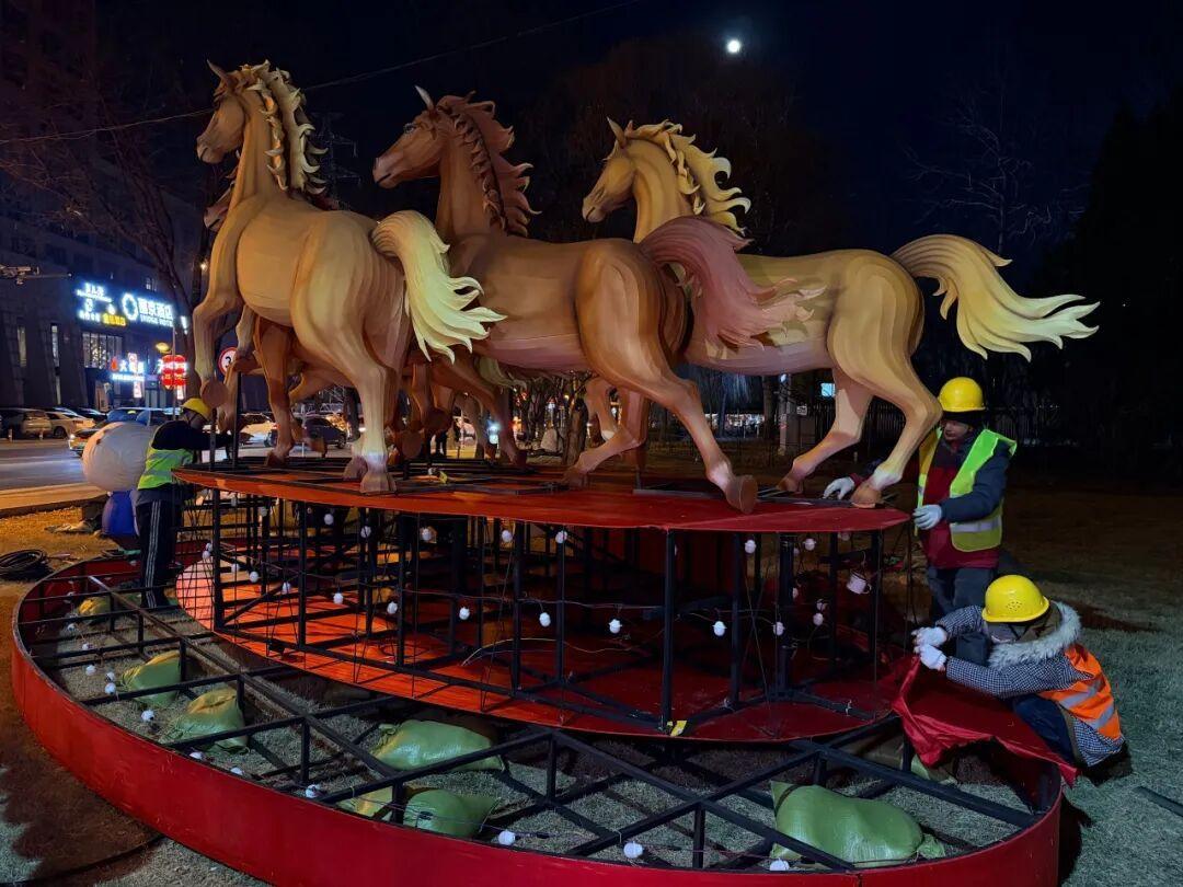 景观小品安装完成后进行亮灯测试。“今年的春节景观布置,融合了马年生肖文化与顺义地域产业特色,打造了兼具沉浸式体验、高颜值形态与本土化叙事三位一体的花灯展览新范式。”区城市管理委市容景观管理科科长张鑫说,欢迎市民节假日期间前来打卡,找找景观布置中藏着的顺义元素,感受顺义的新春氛围,共赴这场马年新春之约。一盏灯笼映新春,一组景观寄祝福。目前,顺义区春节景观布置工作正在有序推进,越来越多的马年主题景观逐步亮相街头。再过不久,所有景观灯将全部点亮,顺义的大街小巷将变得灯光璀璨、年味儿盎然。