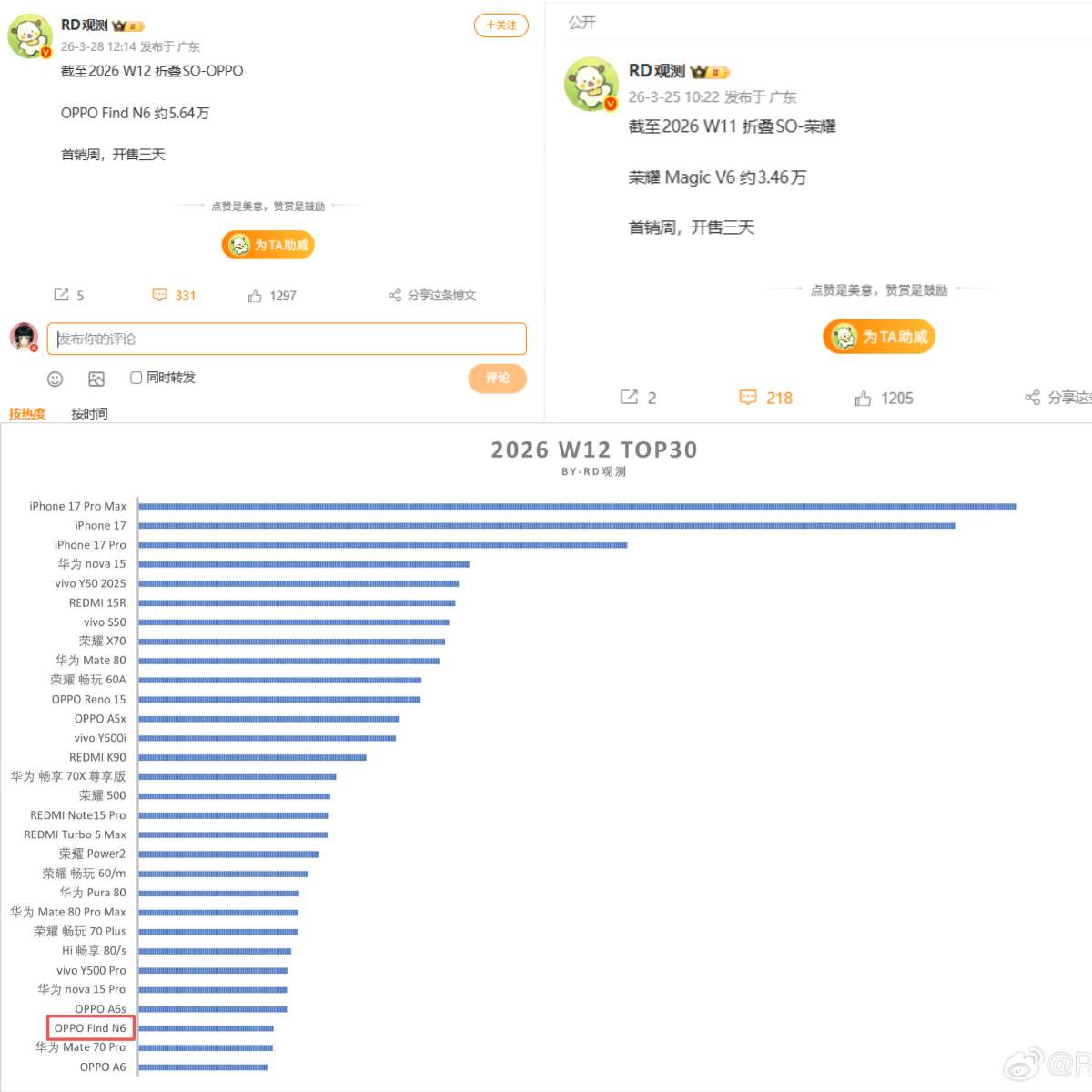 最直接的结果,就是销量给了反馈。Find N6开售三天卖出5.64万台,不只是卖得不错,而是直接做到同期折叠品类里卖得最好。再往后看,它还冲进了第十二周全国销量前三十,更关键的是,在这个榜单里,它还是唯一一台国产万元产品。这组成绩放在当下的手机市场里,其实挺说明问题的,用户愿意为折叠屏花钱,但前提是你得先把最基础的体验问题解决掉。