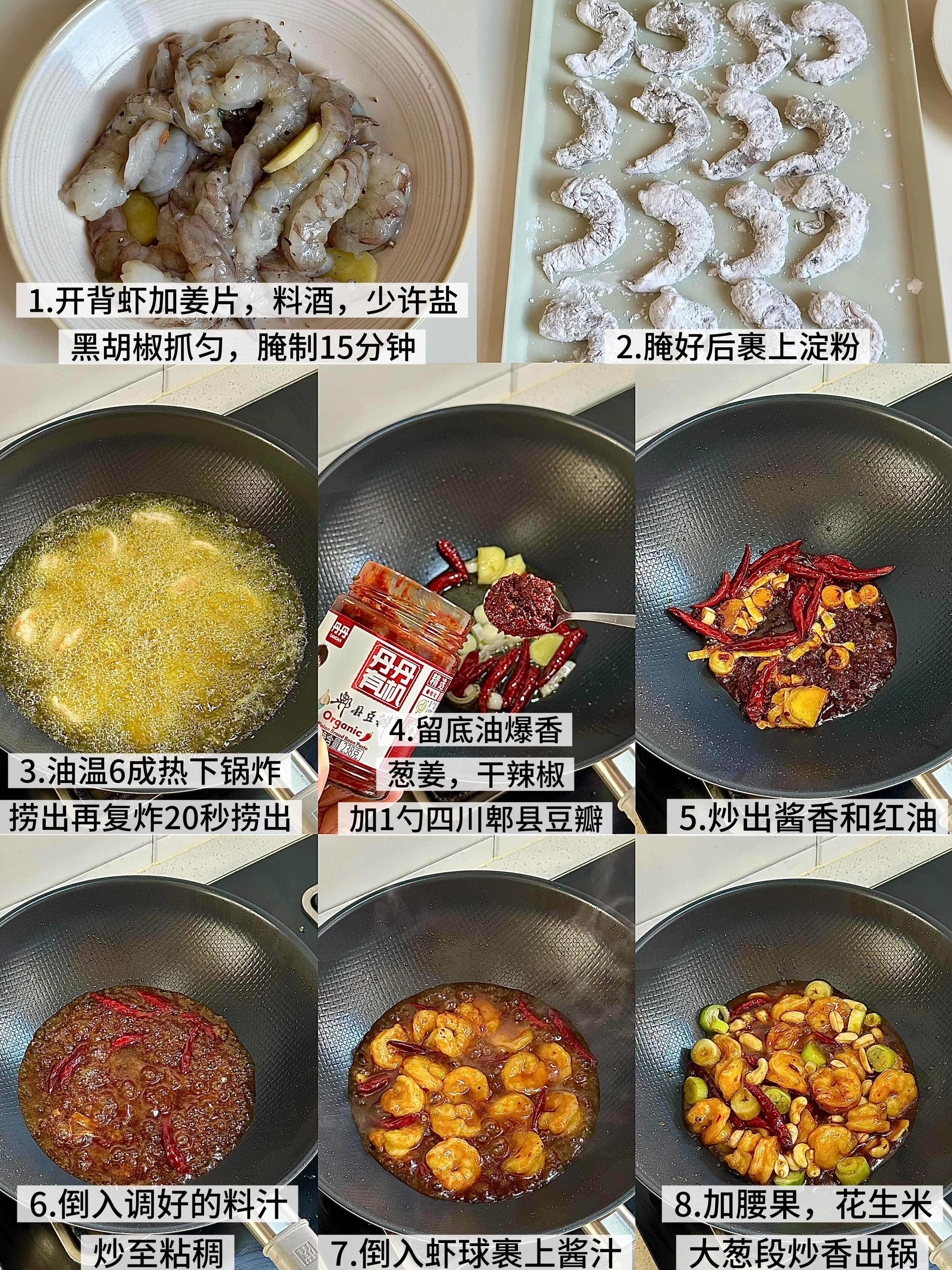 开始炒制时,先留少许底油爆香葱姜和干辣椒段——这一步要开小火,避免辣椒炒糊发苦。闻到香味后加一勺郫县豆瓣酱,炒出红油后倒入调好的酱汁,转大火煮到酱汁冒泡、略微粘稠。接着倒入炸好的虾球,快速翻炒让虾仁裹满酱汁,最后加葱段、花生米和腰果,翻炒均匀就能关火啦!如果喜欢更浓郁的口感,可以撒点熟芝麻增香;如果家里有花椒,炒干辣椒时加几颗,麻味会更突出。