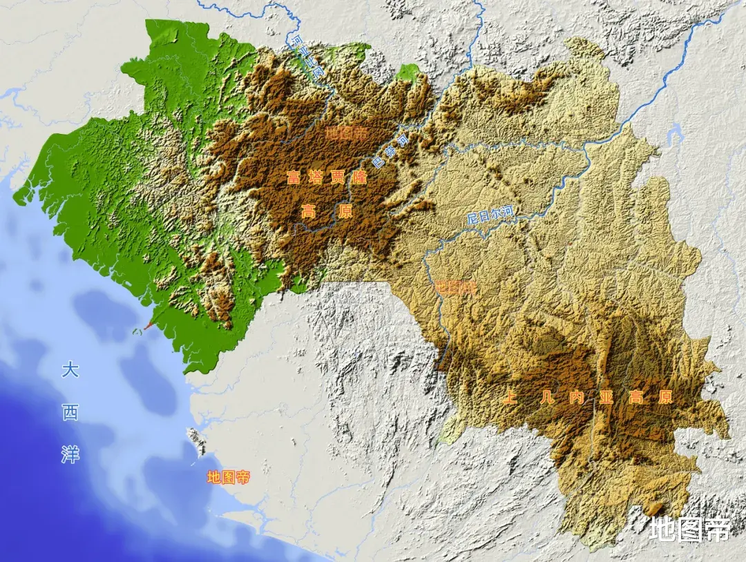 几内亚地势分为三级阶梯,西部为沿海平原;中部为富塔贾隆高原,尼日尔河、塞内加尔河、冈比亚河均发源于此,称为“西非水塔”;东部为几内亚高原,最高峰为宁巴山,海拔1752米。