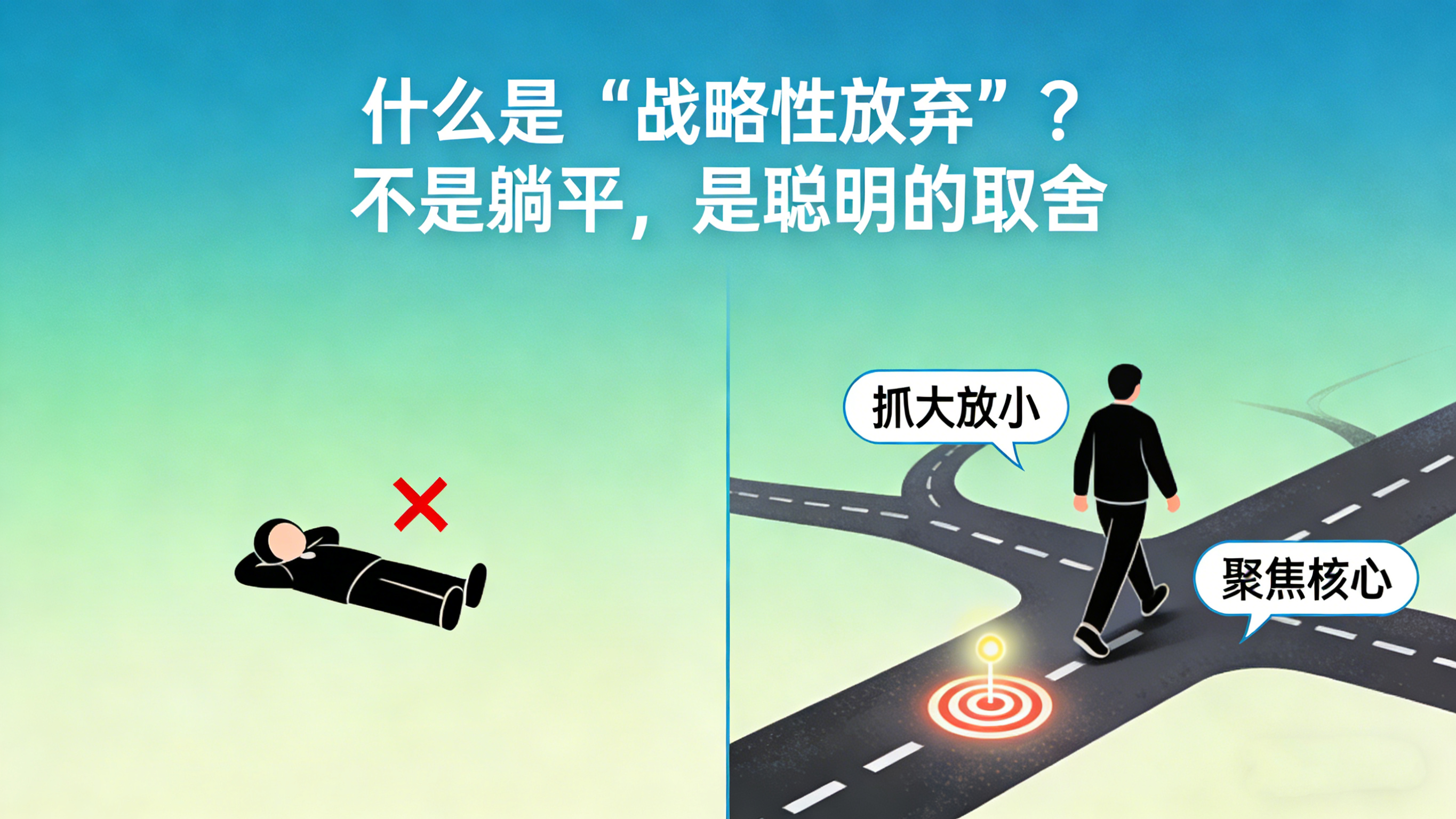 一听到“放弃”,很多人就会下意识抵触,觉得这是偷懒、是妥协。但战略性放弃和躺平完全是两码事:躺平是彻底摆烂、什么都不做;而战略性放弃是“有选择地不做”,放弃的是无关紧要的干扰项,守住的是核心目标的主赛道,是聪明人的取舍智慧。