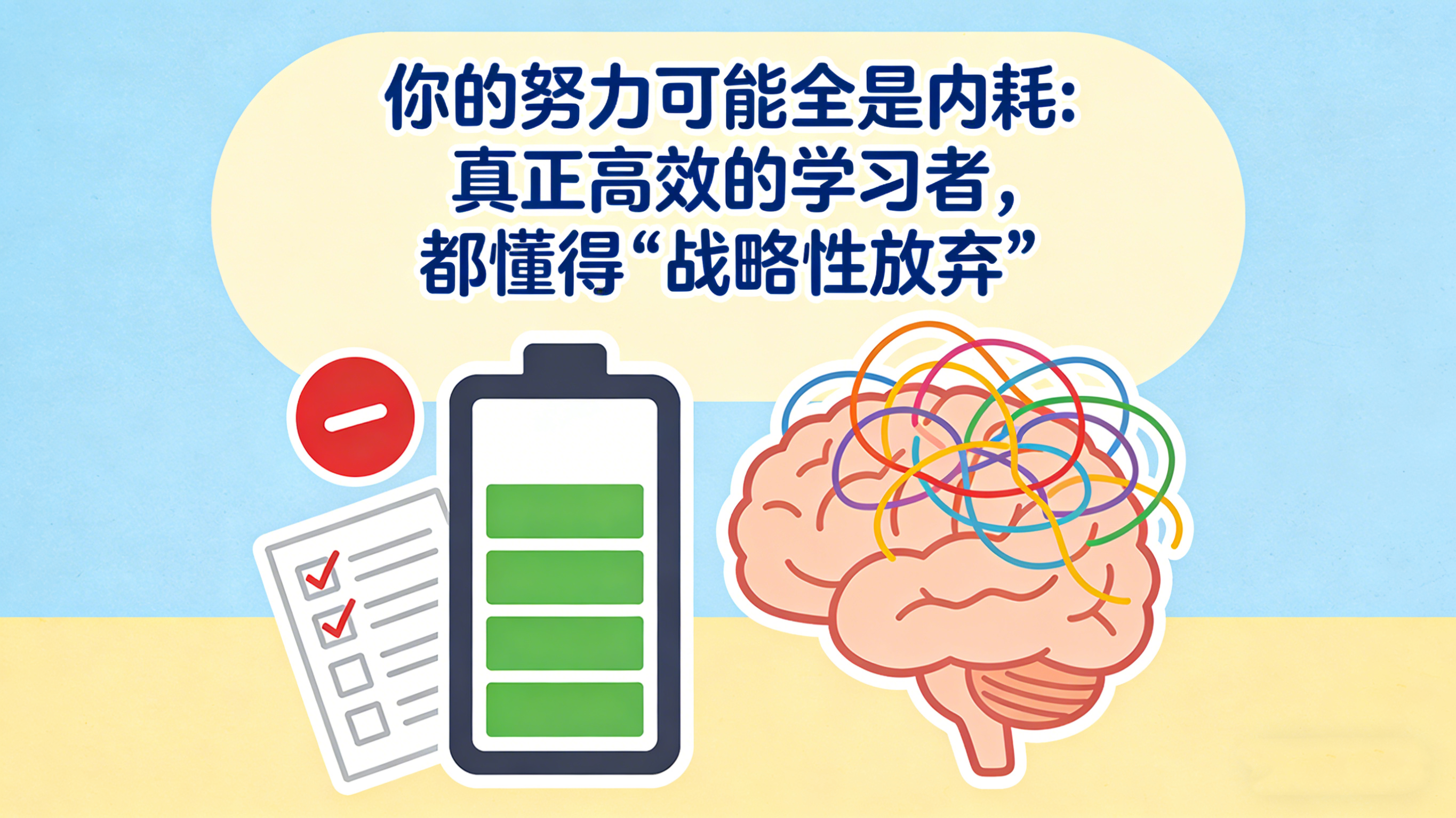 我们总被“努力就有回报”“多学一点不吃亏”的想法绑住手脚,默认抓得越全、做得越满,效率就越高。可真相是,很多努力都是自我感动式内耗——精力被分摊到一堆无关紧要的事上,看似忙得脚不沾地,连核心目标都抓不住,最后耗光了时间、磨没了心力。而真正会学习、能高效成长的人,都藏着一个秘诀:战略性放弃。这不是躺平摆烂,而是主动做减法、精准取舍,把有限的精力花在刀刃上,用“少而精”的努力,换翻倍的成长回报。