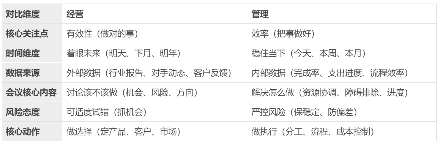 开会或讨论前,不妨先问一句:“咱们接下来半小时,重点是定方向(经营),还是抓落实(管理)?”