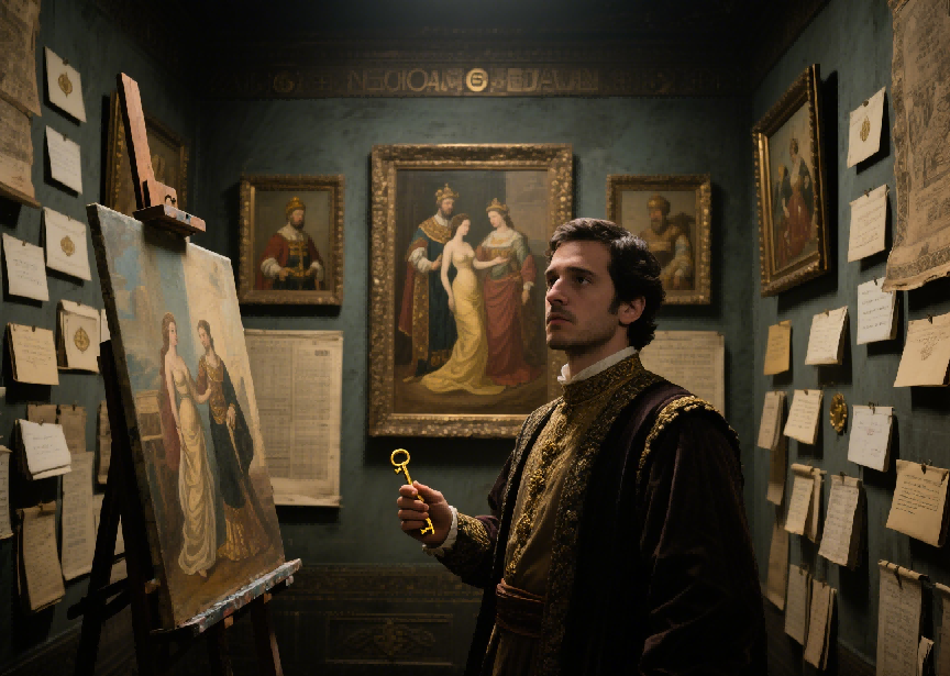 “你终于醒了。” 这个声音让我浑身一震,是国王的声音。他不知何时坐在了我对面的椅子上,脸上带着疲惫又复杂的笑容。我疑惑地抬头看着他,心中满是不解。国王却像是看穿了我的心思,缓缓开口,说起了他的过往。原来,他年轻时被家族安排与王后成婚,但王后性情冷淡,他渴望被爱,于是便有了那些情妇。而国家金库秘密供养情妇的事情,是他的心病。他知道自己大限将至,却不知该如何平息这一切引发的风波。他希望我能帮助他,用我的画笔和智慧,为他和王国留下一个体面的结局。