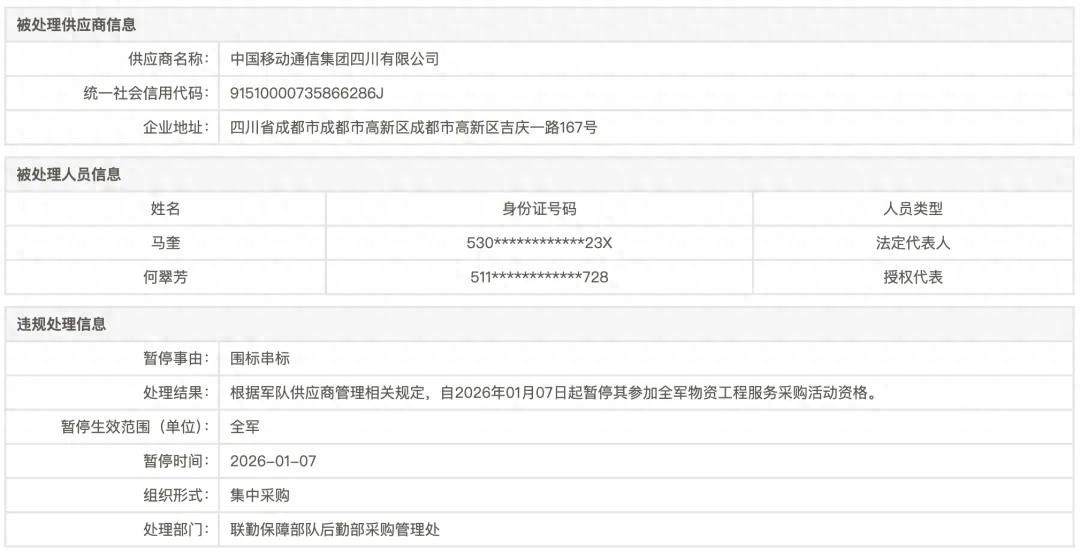 2025 年 1 月 7 日,军队采购网发布《中国移动通信集团四川有限公司暂停处理公告》。