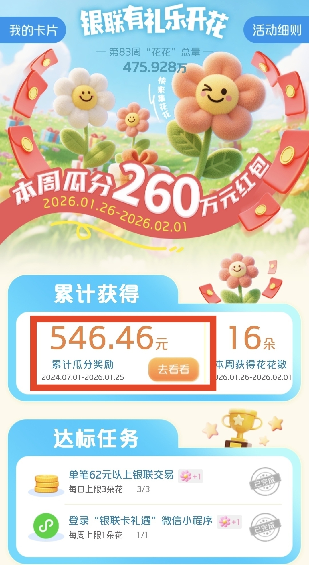 这个活动也开展有几年了,之前的时候还有各种数不过来的达标漏洞,现在达标的路子越来越少了,给的奖励也少很多,基本上天天三朵花的,每周一也只能领8-9元,到目前为止,我也只撸了546.46元。