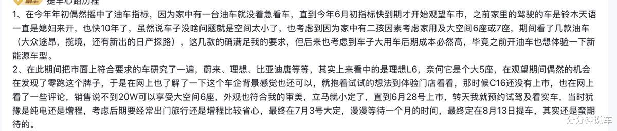 第三位车主同样是为家庭购车,家里的二娃已经长大,原本的5座SUV已经不能满足空间需求了,所以这次也把重点放在了大空间的SUV,最终零跑C16的6座布局、颜值和实惠的价格,吸引了他。
