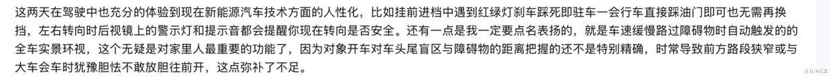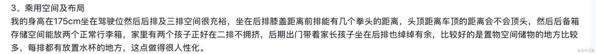 第二位车主是增购车辆,由于有了二孩,所以考虑买6座或者7座SUV,看了蔚来、理想、比亚迪等品牌的车型,要么就因为价格放弃,要么因为不合适的座椅布局放弃,而后关注到零跑C16,不到20万可以买大空间6座,有增程还有纯电,最终选择了增程版车型。根据车主反馈,身高175cm的他,不管是驾驶位置还是第三排的空间都很充裕,后备厢也可以正常满足放2个行李箱,家里有2个孩子坐在二排非常舒服,后期即便带着家里老人和两个孩子,全家6人出行,空间也绰绰有余。而且车辆的安全性不错,车速缓慢路过障碍物时,会自动打开全景影像,对于盲区可以很好的观察。