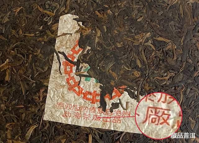 这个傣文符号是怎么来的呢?早年普洱茶包装统一,而且没印日期,大家很难判断年份。为了解决这个问题,阮殿蓉厂长和厂里的技术人员想了不少办法,最后注意到勐海茶厂的门头、公章上都有傣文字样,就决定把“茶”字的傣文印在内飞右下角。