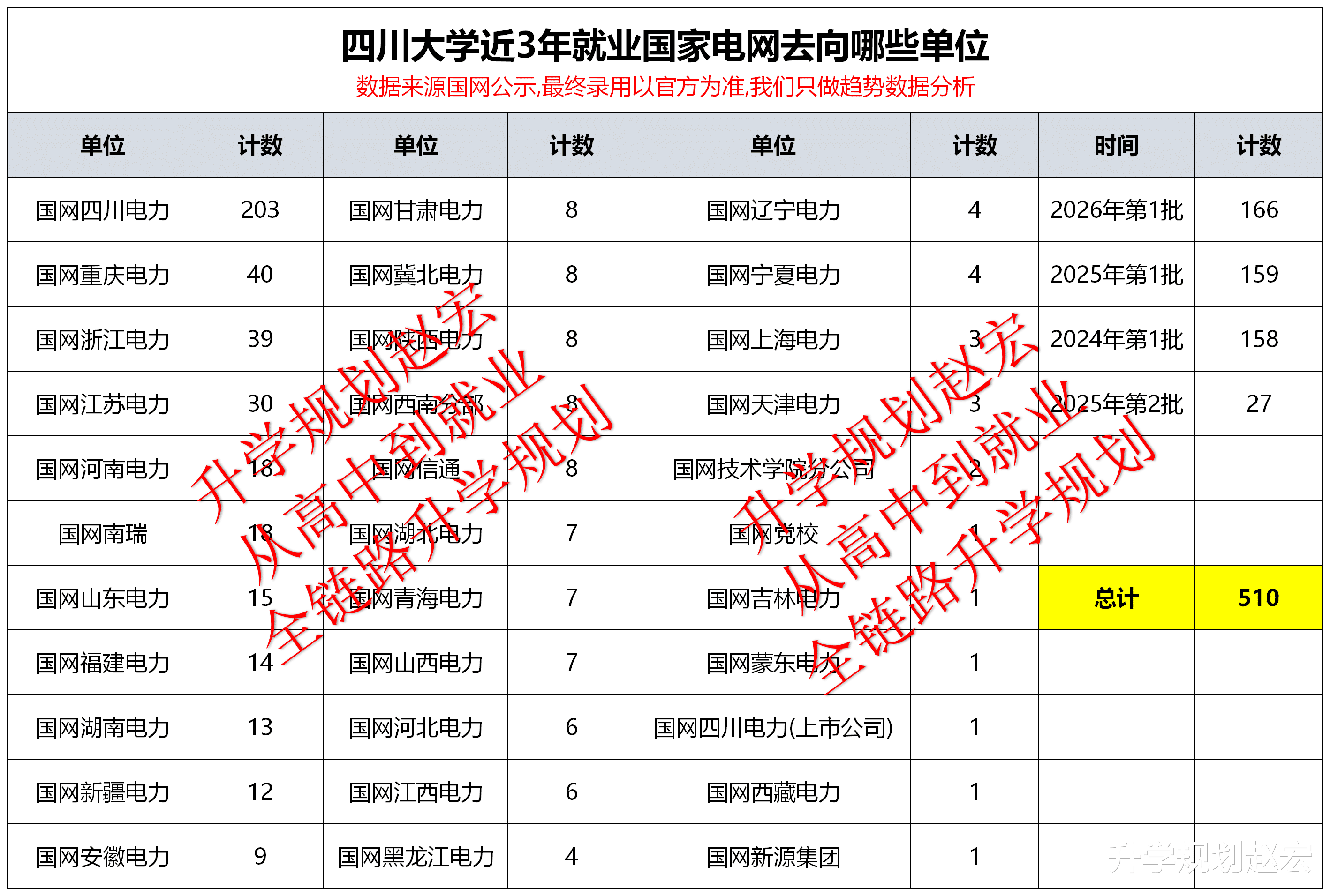 本文咱们来看看四川大学毕业生进国家电网,都去了哪些单位,单看一年的数据,其实规律没那么明显。所以我们把近三年的数据放到一起来看。总共510人,2026年第一批166人,2025年第一批159人,第二批27人,2024年第一批158人。主要人数也是在第一批,并且最近几年的人数都是差不多的。结果就很明显了,四川大学每年上岸国家电网的人数有多少。另外这部分人数当中,大部分也是提前批的,第二批非常少。另外这些同学当中,大部分也是电气专业的毕业生。如果咱们要985大学,同时要电气专业,那么报考和转专业就非常重要。
