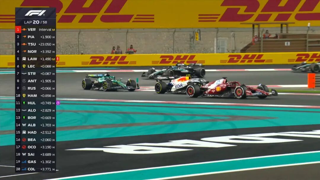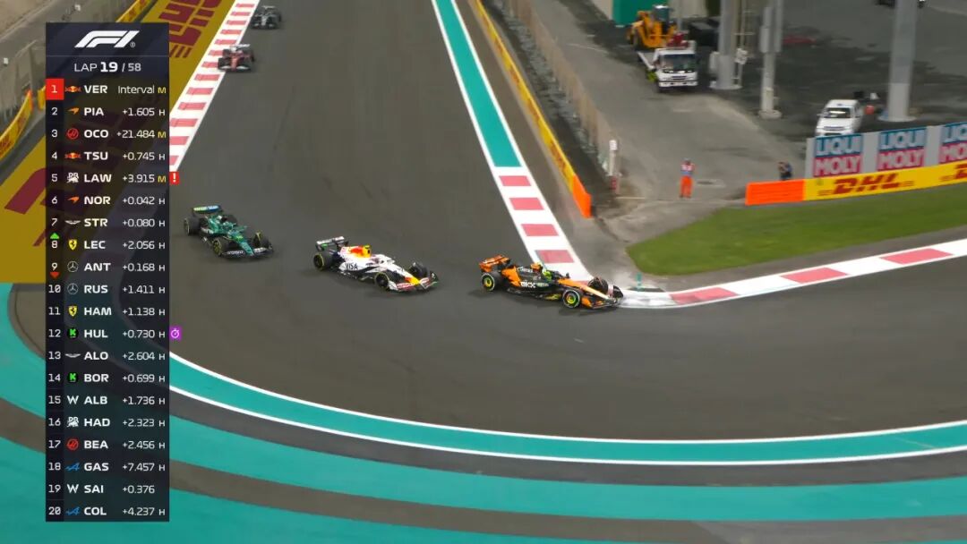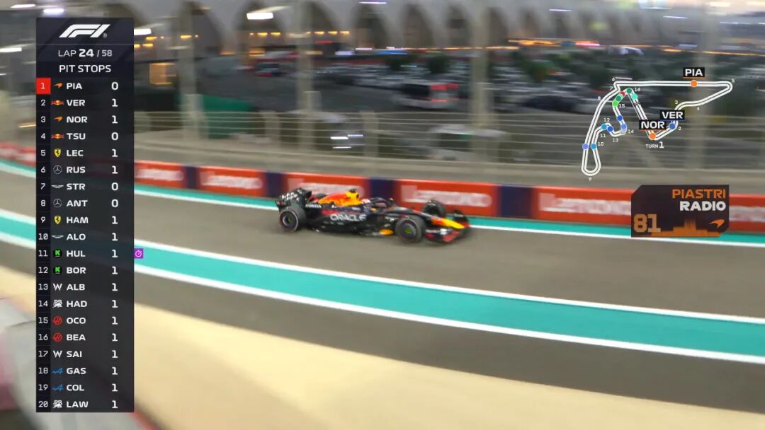 下一圈,维斯塔潘进站,场上的领跑者变为皮亚斯特里。随后FIA给出判罚,此前诺里斯对于角田的超车被记录,随后表示角田在防守时因将诺里斯挤出赛道也被记录。随后赛会给出判罚,角田因多次变线被罚5秒,诺里斯潜在的四轮出白线不再调查。