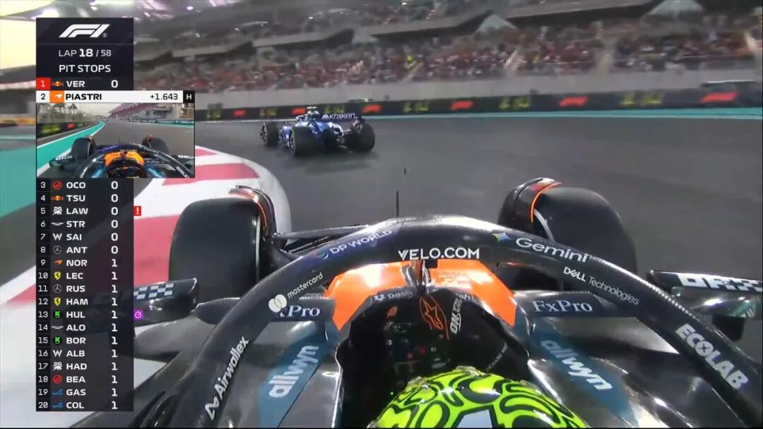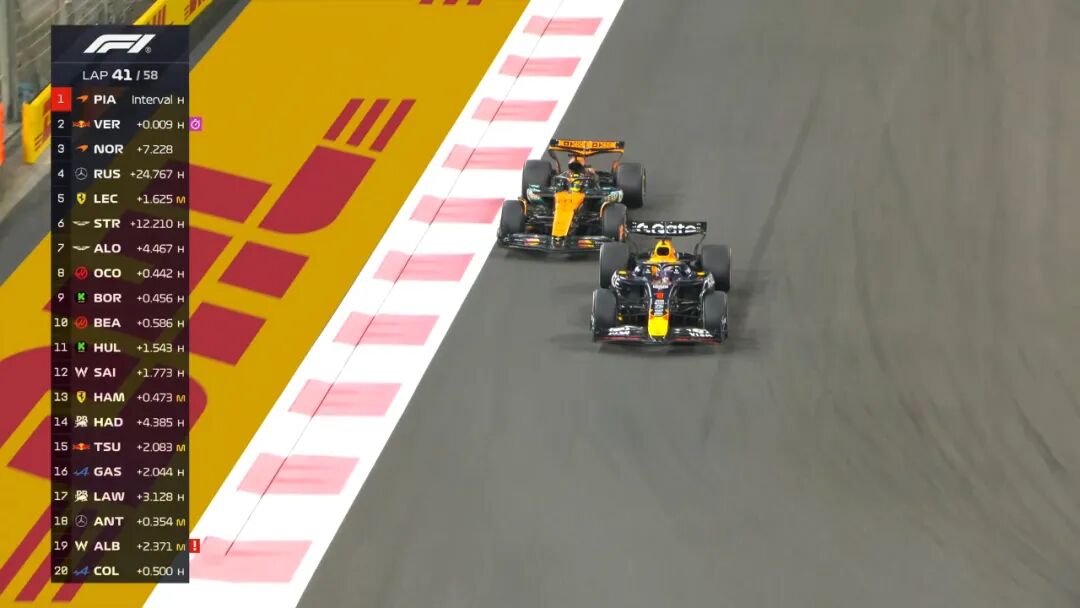 第41圈,追到皮亚斯特里身后的维斯塔潘完成超越,前者也没有防守。被超后,皮亚斯特里立刻进站,出站后压在诺里斯身前约4秒左右。
