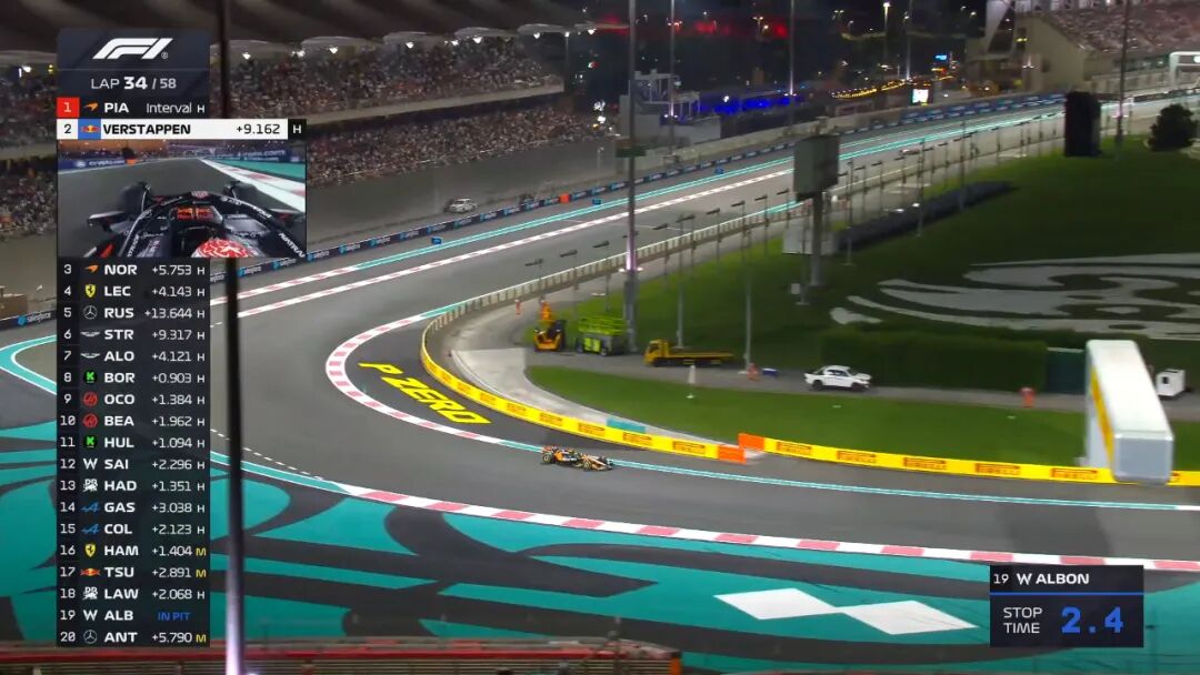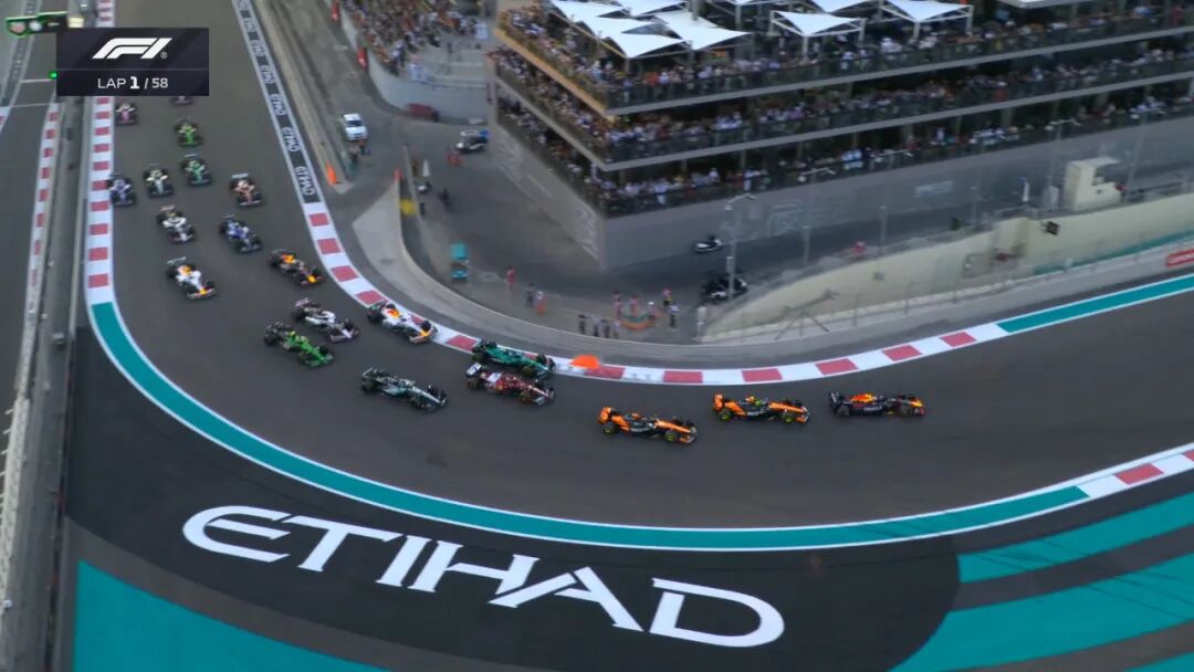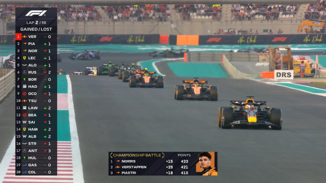 在比赛后期,诺里斯逐渐拉开勒克莱尔的差距到7秒。最终维斯塔潘夺得冠军,皮亚斯特里获得亚军,诺里斯虽获季军,却以两分的优势加冕本赛季的F1世界冠军!勒克莱尔第四,拉塞尔第五。第六至第十分别为阿隆索、奥康、汉密尔顿、贝尔曼和斯托尔。