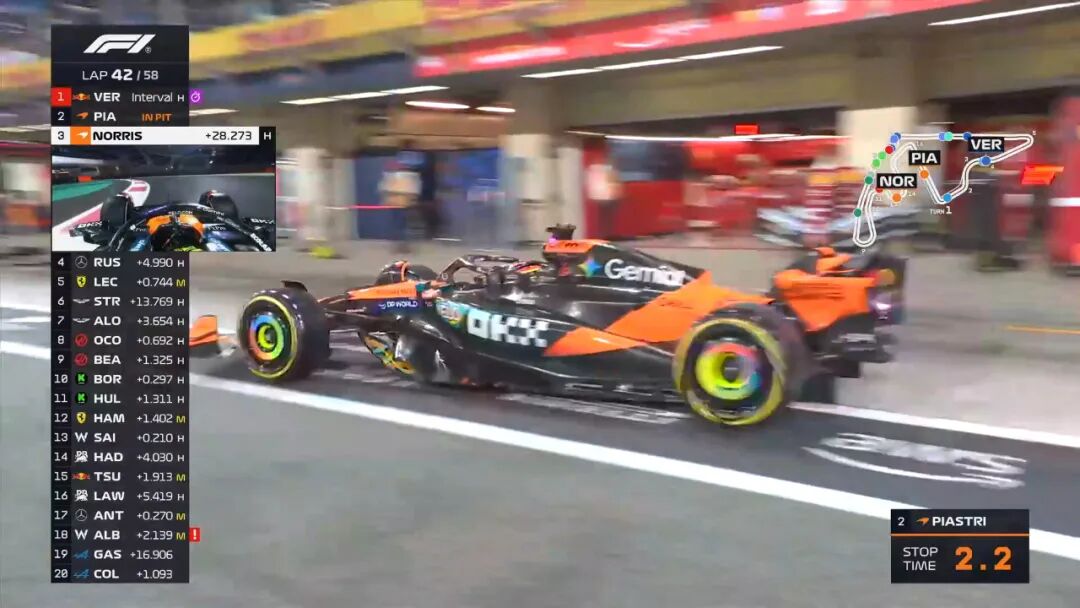 第42圈,皮亚斯特里终于进站换上中性胎,他在诺里斯身前五秒左右出站。勒克莱尔超越拉塞尔回到P4。