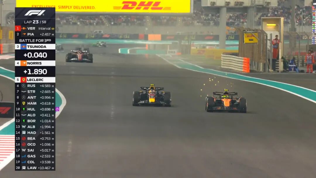 第23圈,诺里斯追到角田裕毅身后快速超车。角田裕毅并没能给诺里斯带来过多的干扰,并且还因多次变线被罚时5秒。