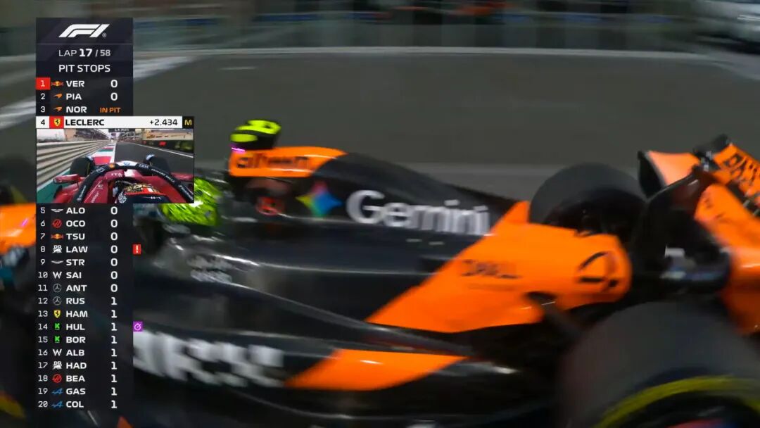 第17圈,诺里斯和勒克莱尔同圈进站!出站之后,诺里斯出现在安东内利的身后,不过仅仅两圈诺里斯就完成了超越,并且超过塞恩斯来到第7。
