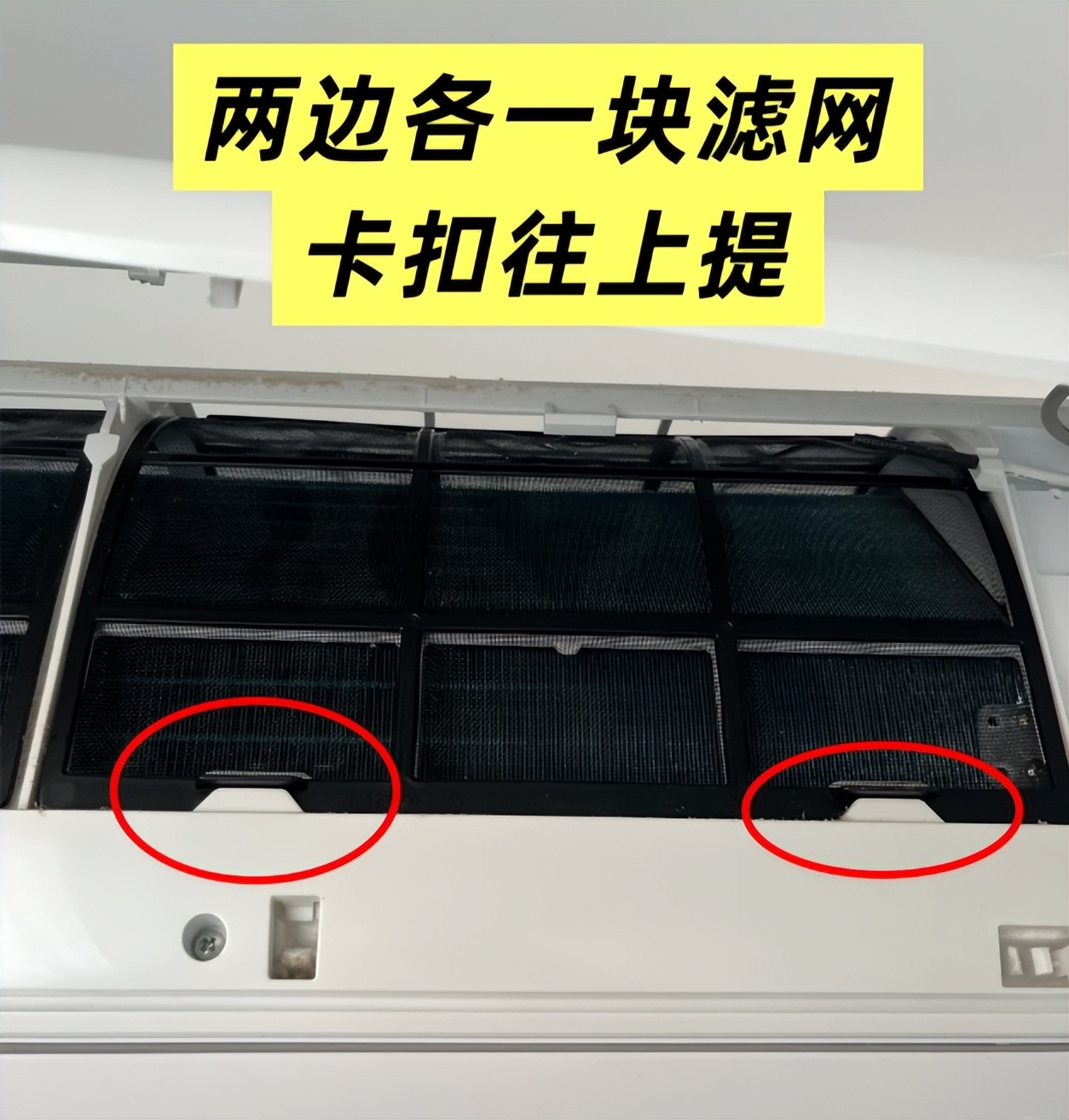 第三步:取出滤网面板抬起后,你会看到1-2片长条形的滤网(像大号防蚊纱窗)。用手捏住滤网中间部位,轻轻抽出来。这时候,请做好心理准备——那片灰黑、甚至发霉的网子,就是你整个夏天呼吸的“第一道空气”。拿到阳台光亮处,你会被上面的灰尘量吓一跳。